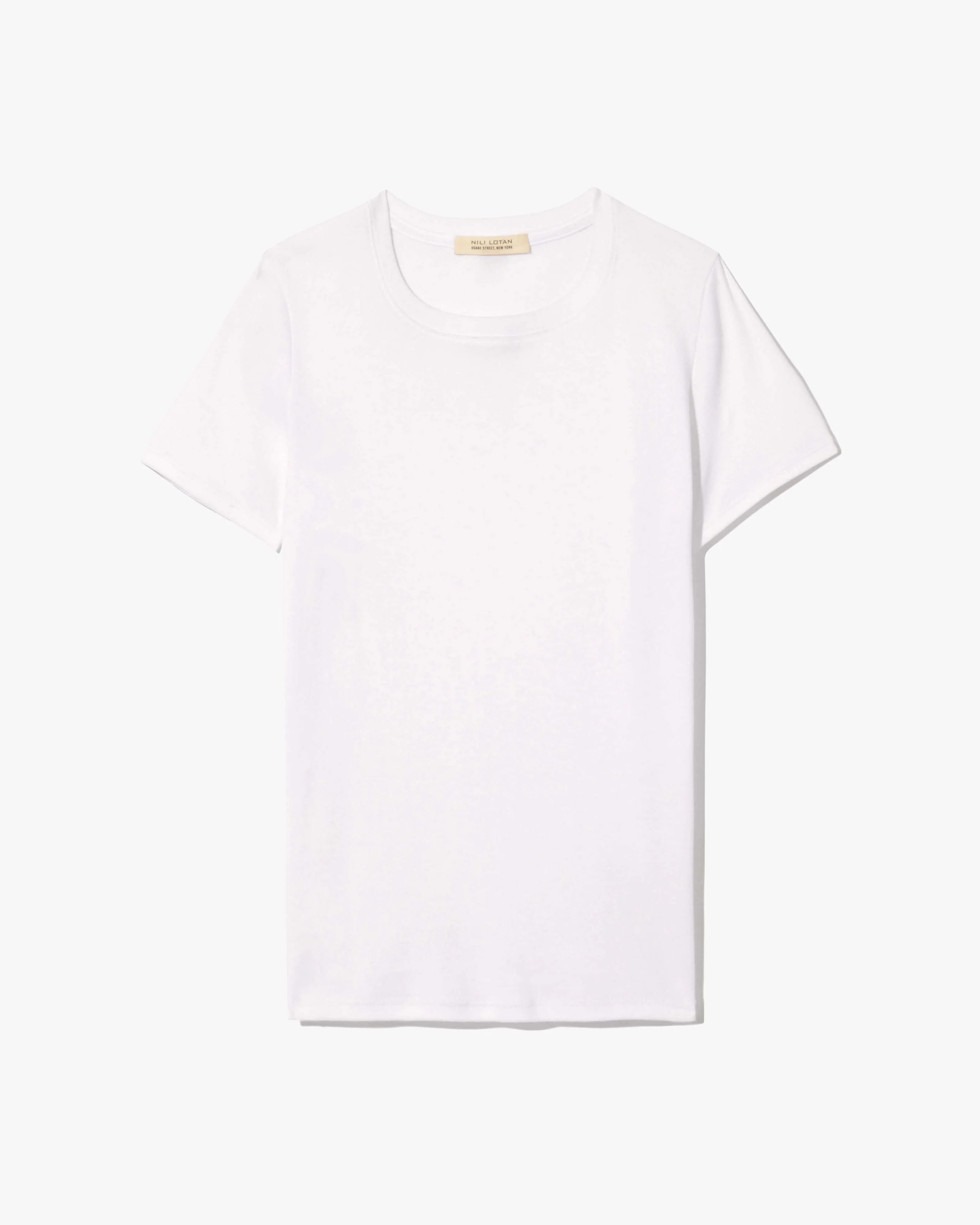 Lightweight crewneck tee in American cotton. Slim body. Self trim at neck. Top stitch detail at neck. Interior binding at shoulder and back neck. Cover stitch at hem and sleeve. Made in USA COMPOSITION & CARE 100% COTTON DO NOT BLEACH TUMBLE DRY LOW LOW IRON DRY CLEAN MACHINE WASH COLD