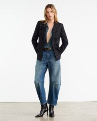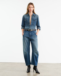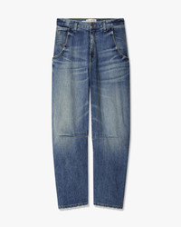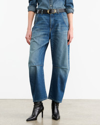 Designed for modern, gently tapered fit, the Emerson jean features a mid rise with a uniquely curved silhouette and dropped back pockets. Intended to be a relaxed slouchy fit. Complete with button zip fly and belt loops. Fabric is premium Japanese denim and is made in Los Angeles. Made in USA SIZE & FIT Model is 5'10 and wears size 25. For exact measurements by size, view our size guide. COMPOSITION & CARE 98% Cotton, 2% Polyurethane / Made in America. MACHINE WASH COLD DO NOT BLEACH TUMBLE DRY LOW LOW IRON DO NOT DRY CLEAN