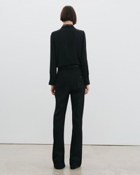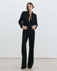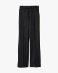 Mid-rise pant with relaxed leg. Extended waistband with curtaining, interior button, and hook-and-eye closure. Pin tuck stitched seam down front and back. Slant pockets. Back welt pockets with button closures. Belt loops. Designed for a 35" inseam. - Made in USA - 100% Virgin Wool - Dry clean only - Low iron