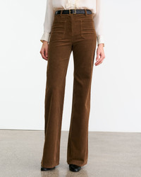 High-rise flare leg pant in corduroy. Front and back top stitched patch pockets. Button fly. Button closure. Belt loops. Designed for a 34" inseam. - Made in USA - 93% Cotton, 6% Polyester, 1% Polyurethane - Machine wash cold - Do not bleach - Line dry - Low iron - Do not dry clean