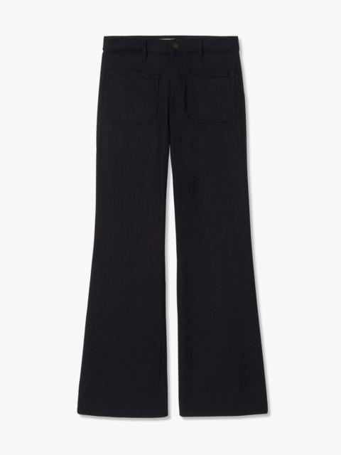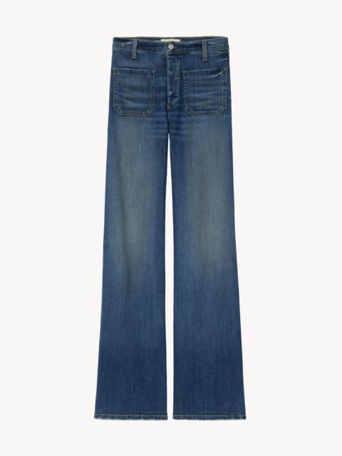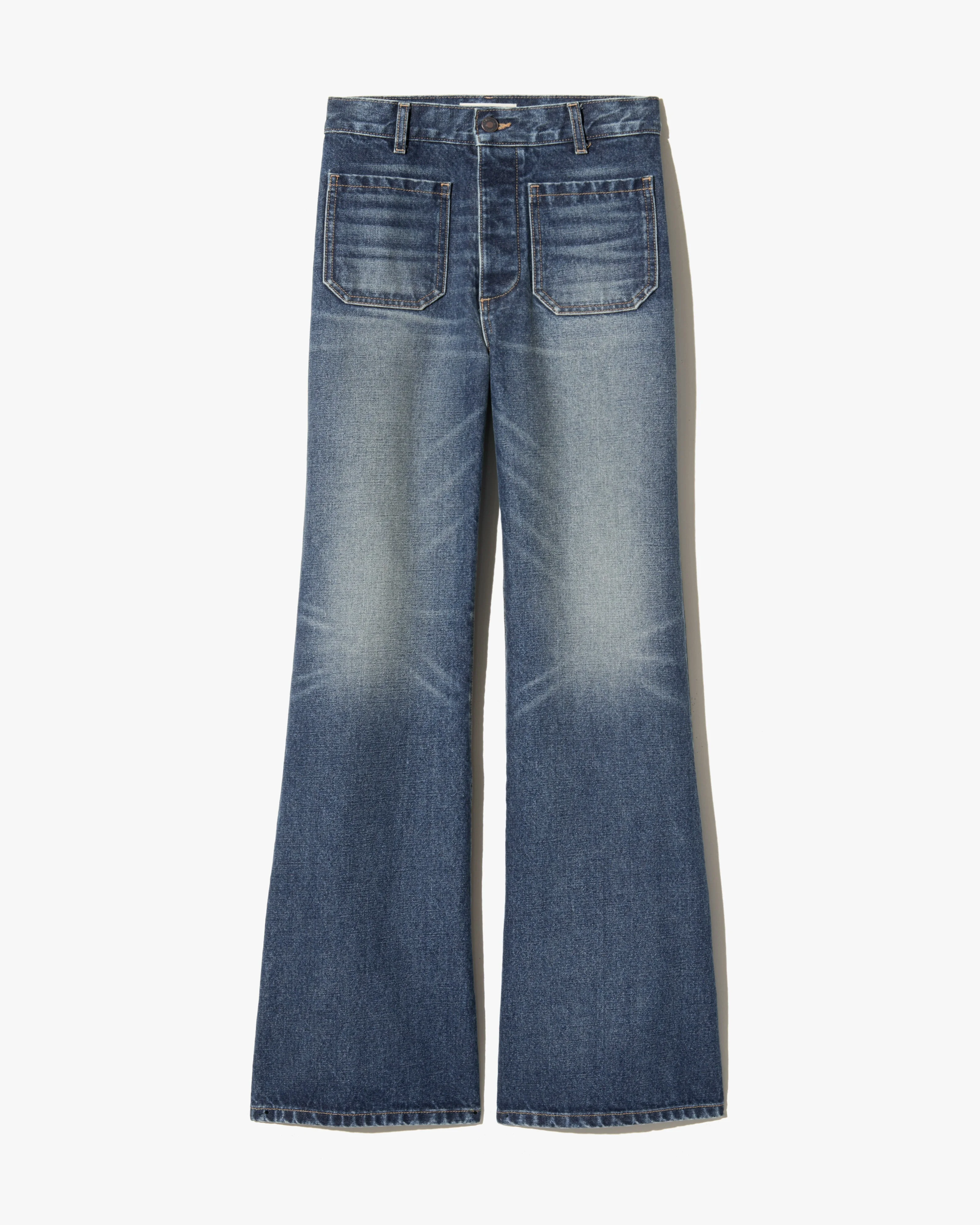High-rise flare leg jean in Japanese non-stretch denim. Fitted through waist and hips. Front and back top stitched patch pockets. Button fly. Shank closure. Belt loops. Designed for a 34" inseam. - Made in USA - 100% Cotton - Machine wash cold - Do not bleach - Tumble dry low - Medium iron - Do not dry clean