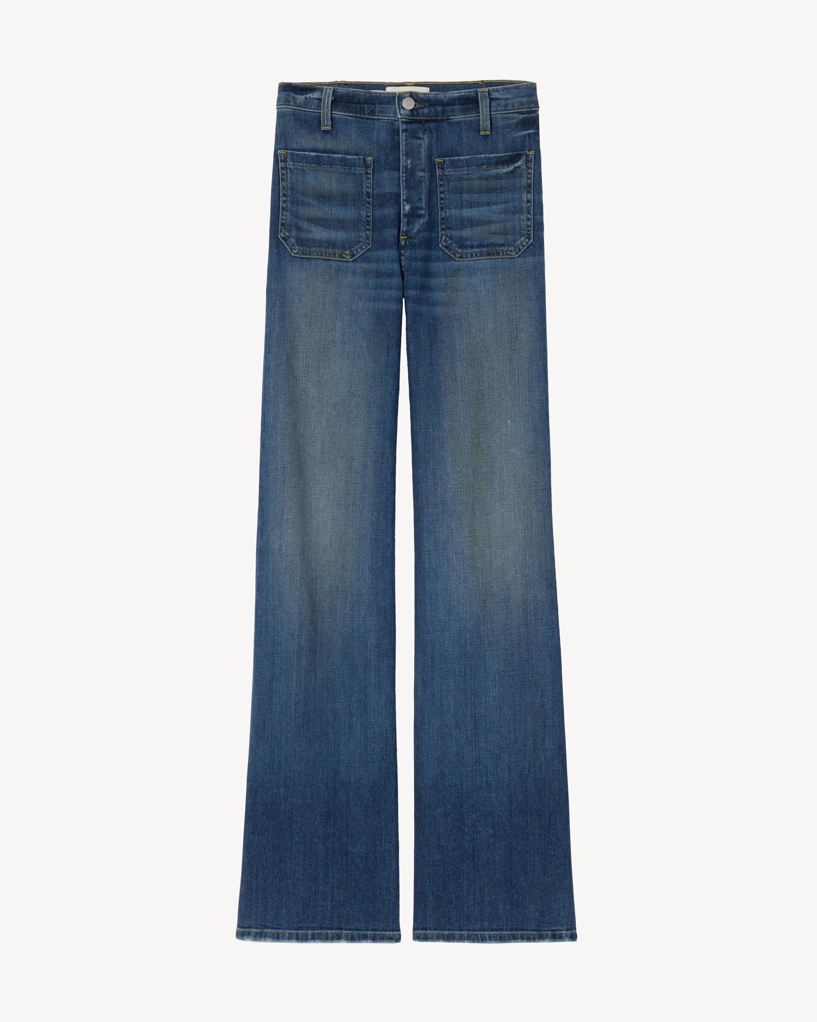 High-rise flare leg jean in Japanese stretch denim. Fitted through waist and hips. Front and back top stitched patch pockets. Button fly. Shank closure. Belt loops. Designed for a 34" inseam. - Made in USA - 98% Cotton, 2% Polyurethane - Low iron - Dry clean recommended
