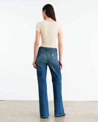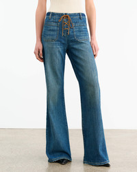 Mid- to low-rise slim flare leg jean in Japanese stretch denim. Fitted through hips. Front and back top stitched patch pockets. Lace up detail in suede. Metal eyelets. Belt loops. Designed for a 33.5" inseam—tailor for a personalized fit. Remove suede cording before cleaning. Made in USA COMPOSITION & CARE 98% COTTON 2% POLYURETHANE Machine wash cold Tumble dry low Medium iron Do not bleach Do not dry clean