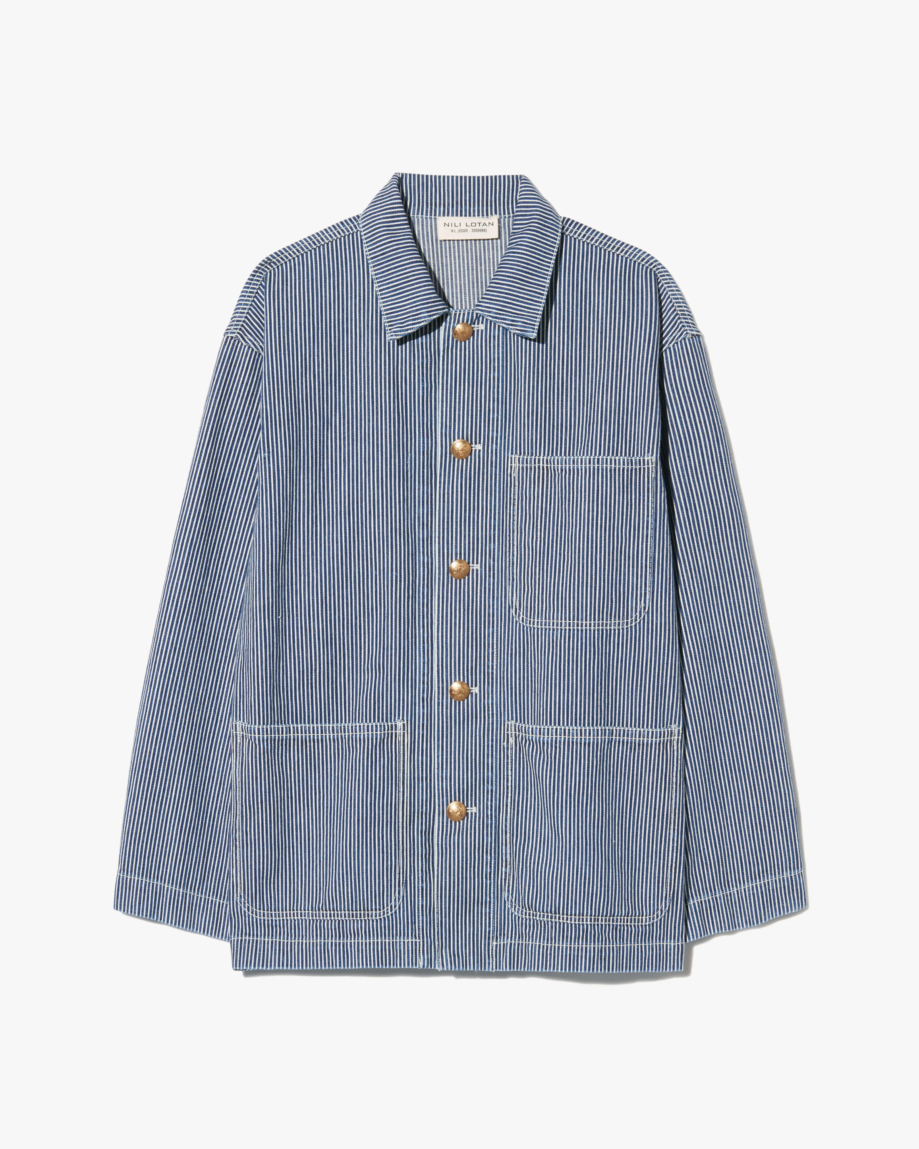 Oversized jacket with dropped shoulders and patch pockets at front. Finished with antique brass buttons. Unlined.