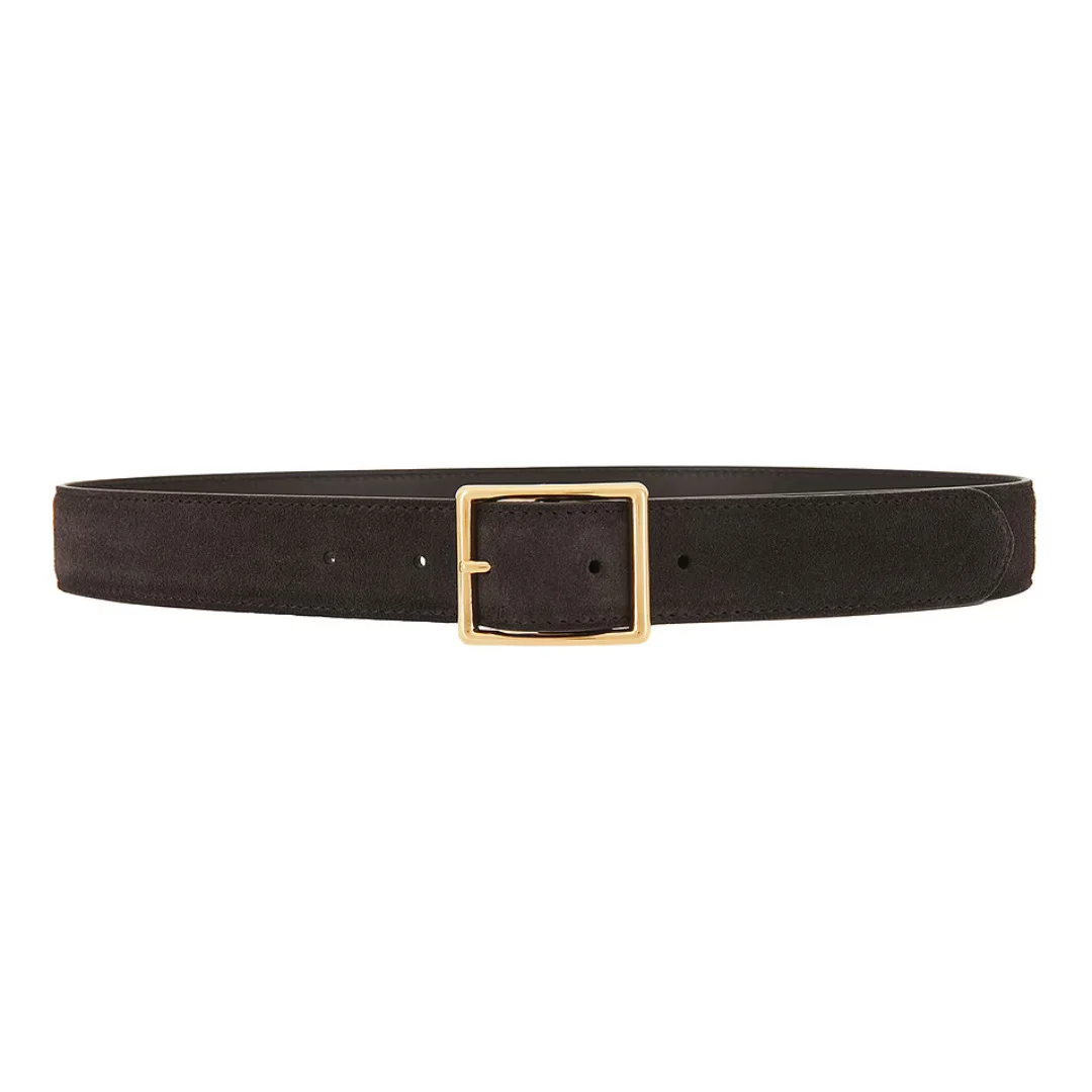 30mm wide belt. Italian smooth suede leather with leather lining. Bombe finish. Custom square buckle with Nili Lotan logo engraving on the back. Color is Espresso