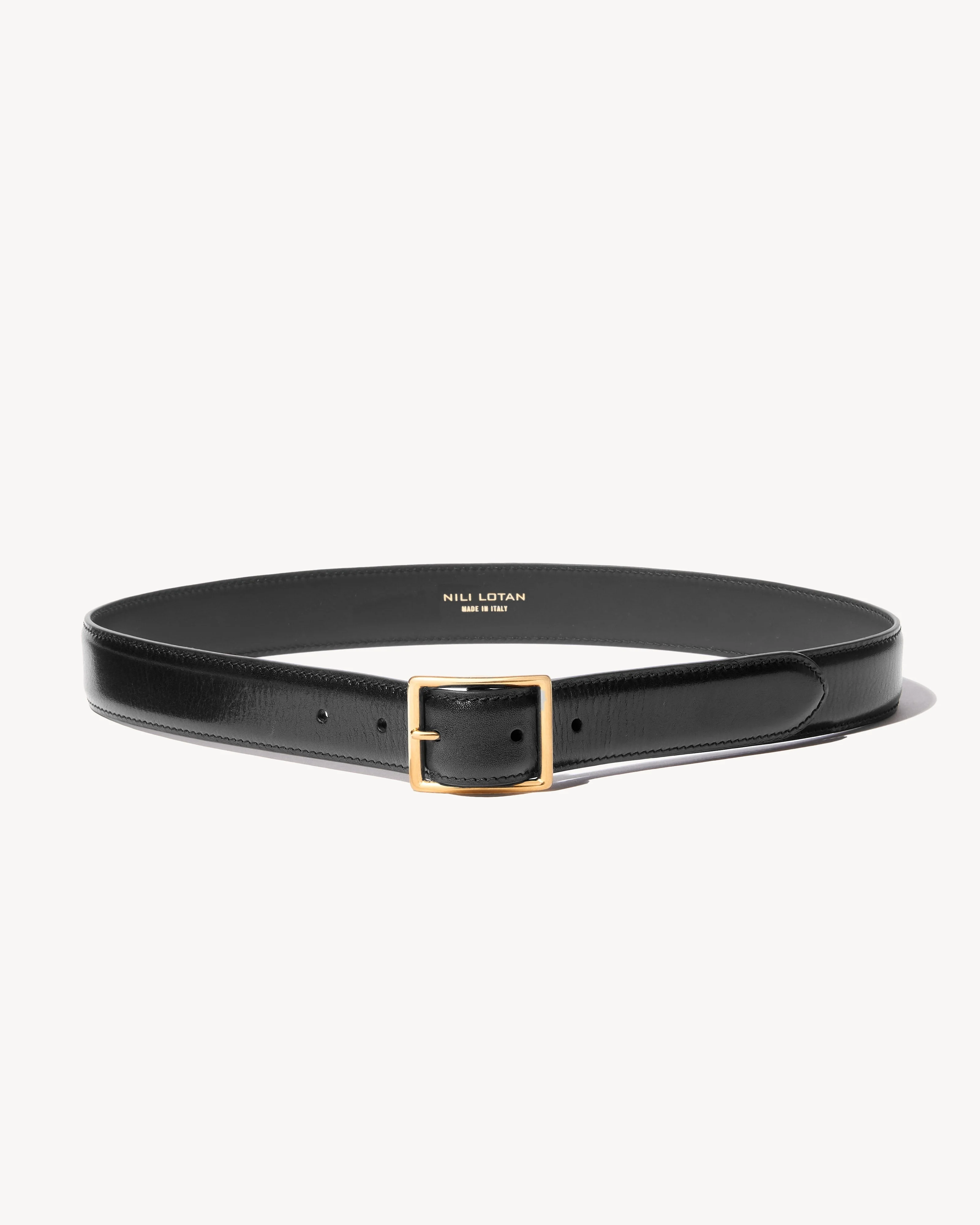 30mm wide belt. Italian smooth calfskin leather with leather lining. Bombe finish. Custom square buckle with Nili Lotan logo engraving on the back. COMPOSITION & CARE 100% Calfskin Leather Professional leather care only Spot clean only