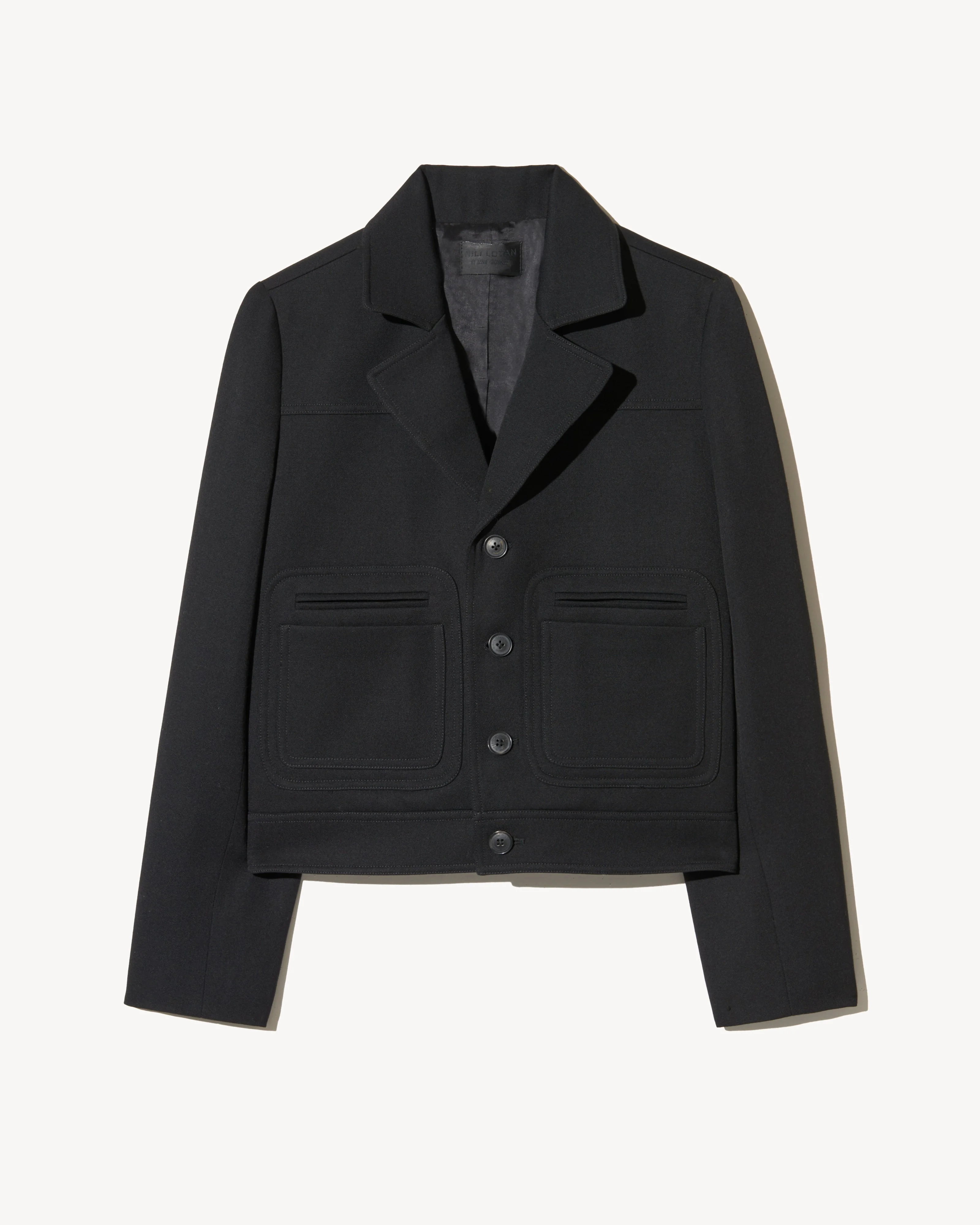 Short, easy jacket. Pocket details including a patch pocket with double entry and a besom pocket. Back yoke with double needle stitch and hem back detail. Topstitching throughout. Logo horn buttons at center front. Full-length sleeves. No interior construction. - 100% Virgin Wool - Dry clean only