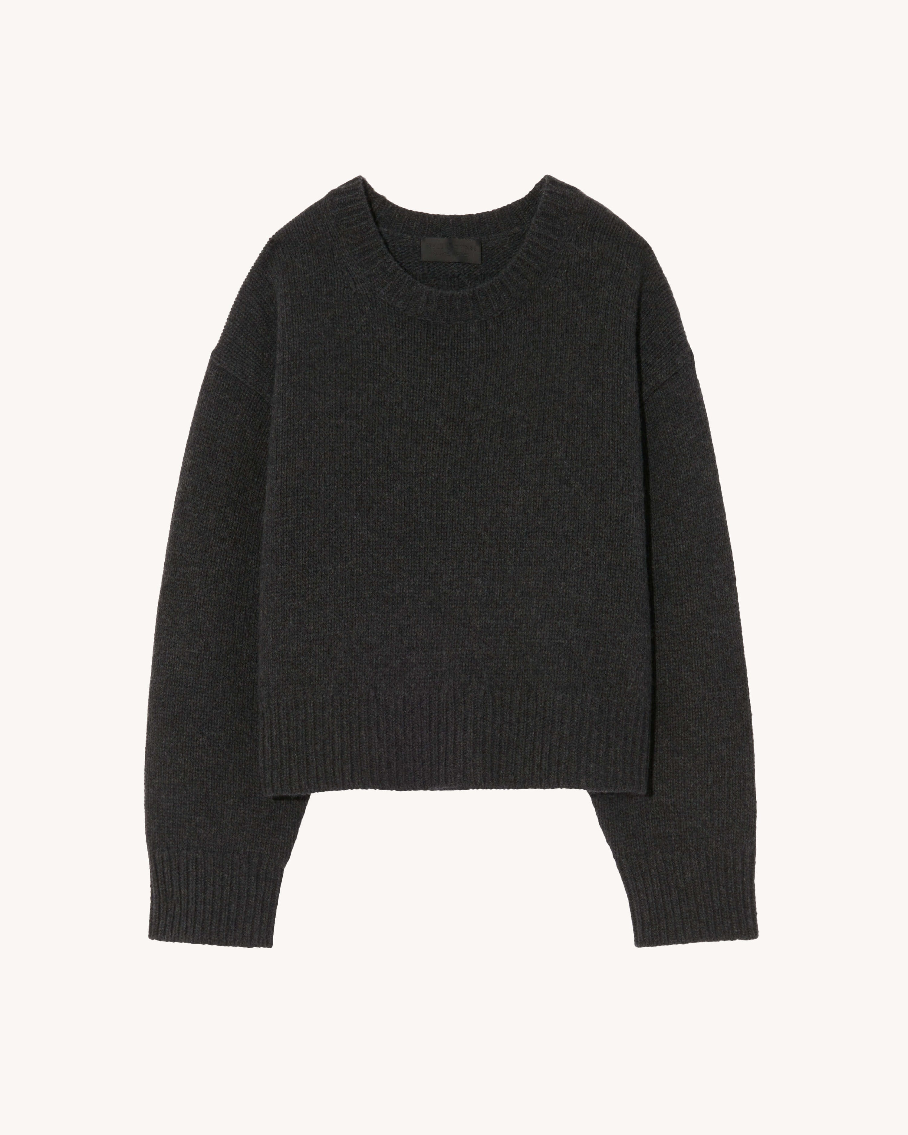 Heavyweight oversized boxy sweater in Italian lambswool. Single layer rib at neck. Dropped shoulder. Ribbing along neck, sleeve and hem. Signature center back cable knit detail. Fully fashioned along arm hole, and shoulder. COMPOSITION & CARE 100% LAMBSWOOL DRY CLEAN RECOMMENDED