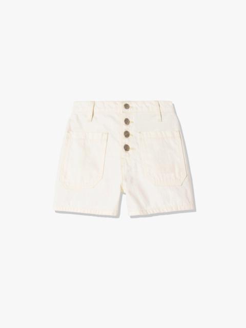 Slim mini short in Japanese non-stretch denim. Fitted through waist and hips. Exposed shank closure at center front. Front and back top stitched patch pockets. Back darts. Belt loops. Made in USA COMPOSITION & CARE 100% Cotton Machine wash cold Tumble dry low Medium iron Do not bleach Do not dry clean