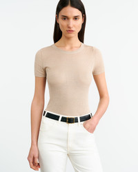 Slim double ply compact ribbed knit tee in Italian silk. Single layer rib at neck. Rib start at cuff and hem. Fashioning details at arm hole and shoulder. COMPOSITION & CARE 100% Silk Dry clean recommended