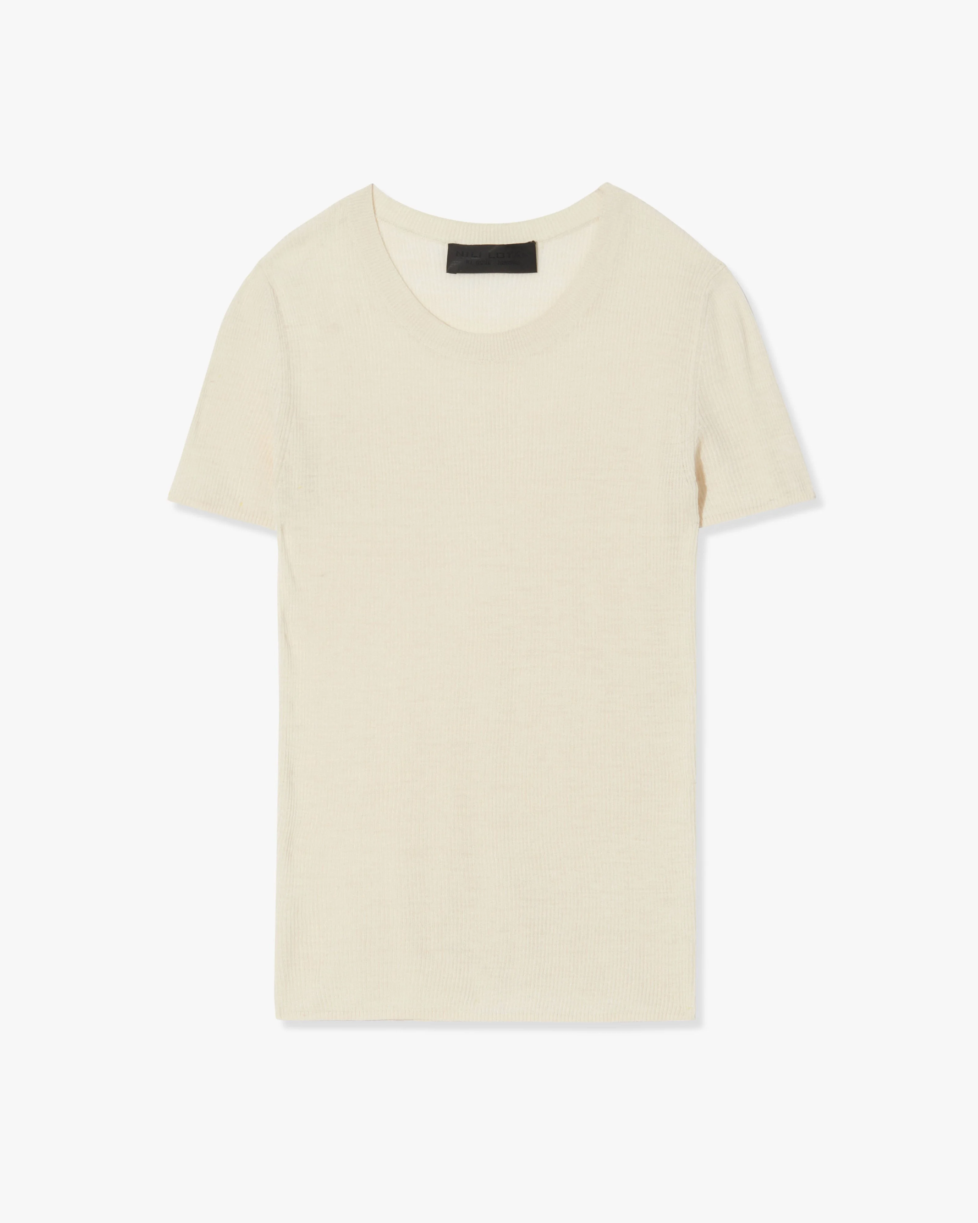 Fine gauge slim rib sweater. Fully fashioned along neck, shoulder andarm hole.