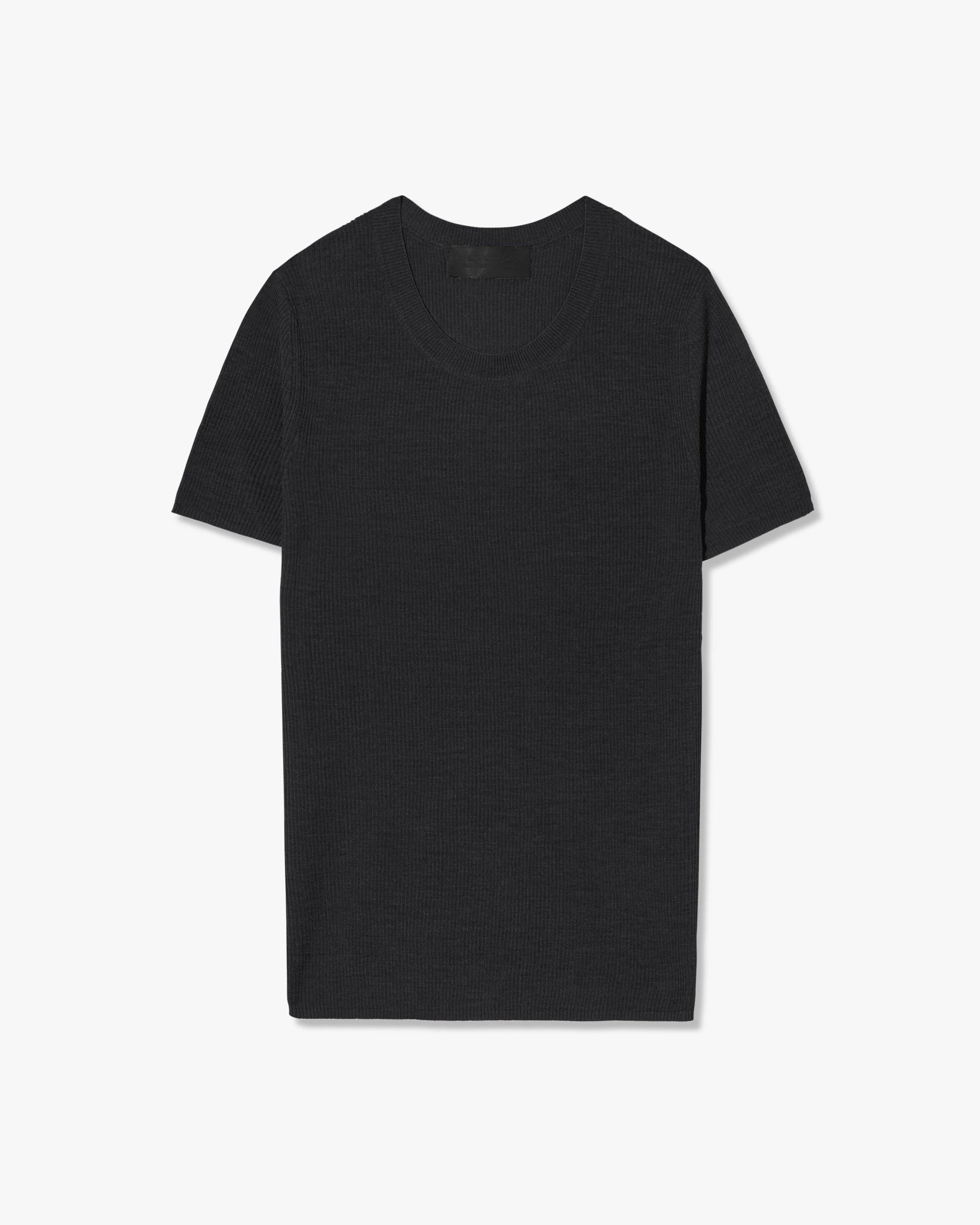 Fine gauge slim rib sweater. Fully fashioned along neck, shoulder andarm hole.