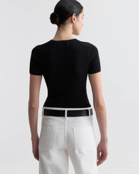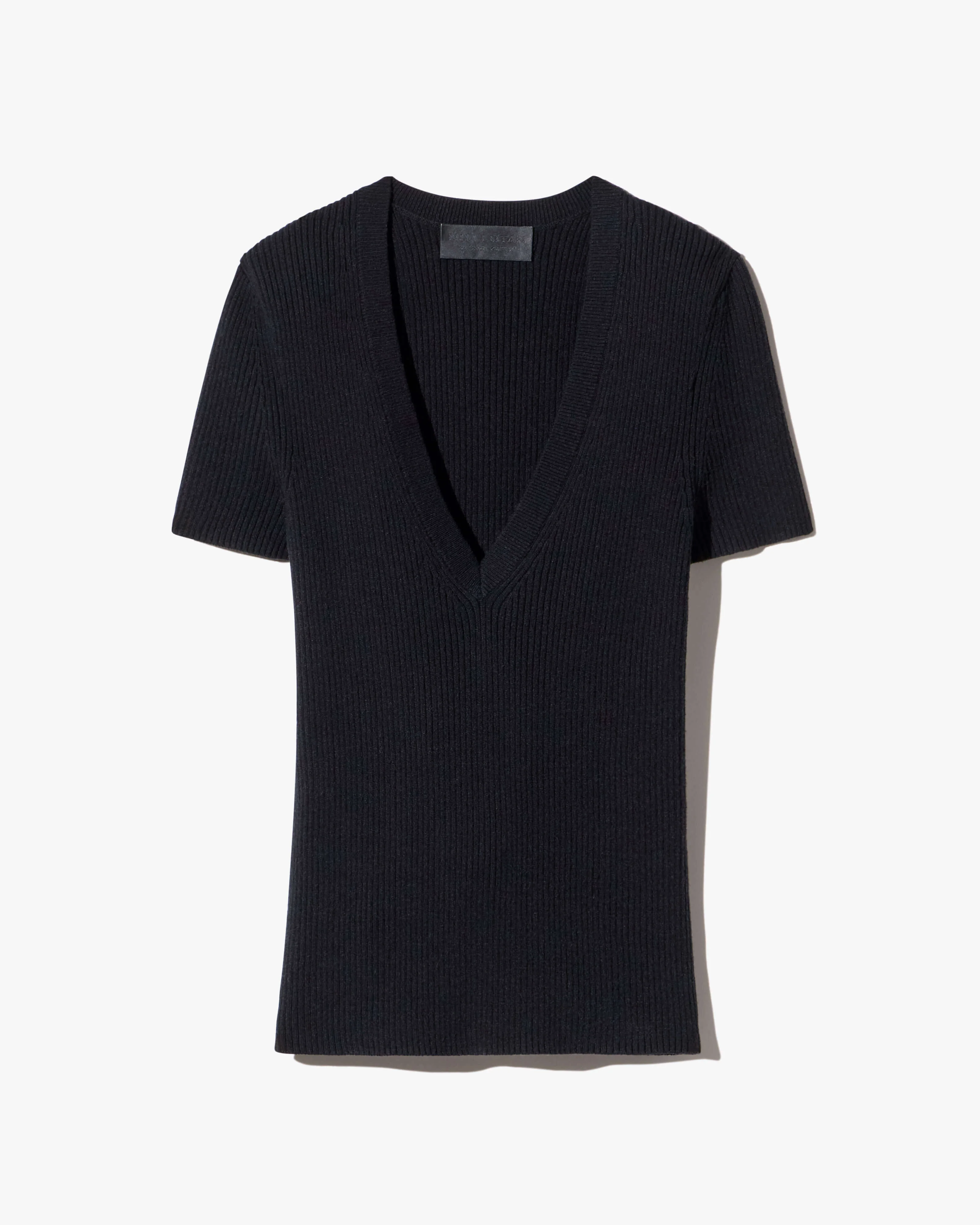 Short sleeve v-neck sweater. Light weight cotton in rib stitch. Slim fit, regular body length, short sleeve length. Contrast color tipping detail at neckline. Fashioning at shoulder and sleeve.