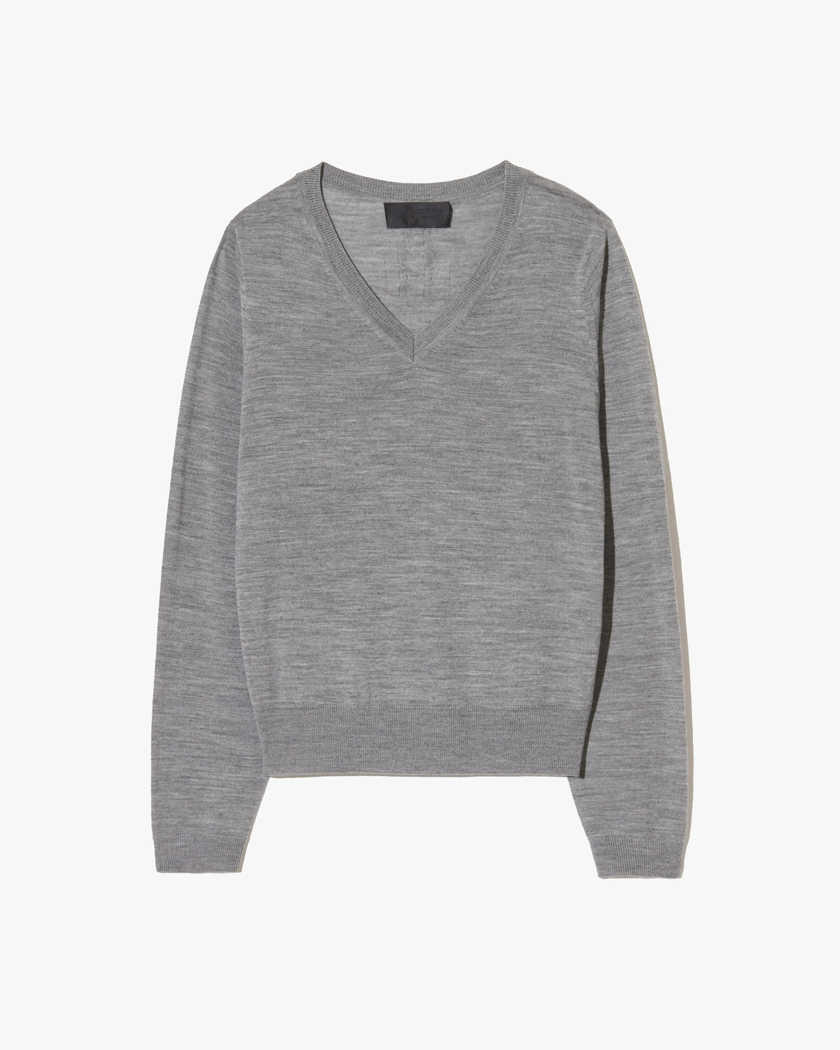 Slim v-neck knit sweater in wool. Fashioning along neck, arm hole and shoulder. Shorter body. COMPOSITION & CARE 100% Virgin Wool Dry clean recommended