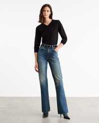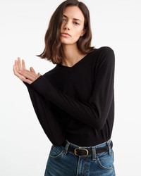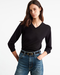 Slim v-neck knit sweater in wool. Fashioning along neck, arm hole and shoulder. Shorter body. Blouson effect. COMPOSITION & CARE 100% VIRGIN WOOL DRY CLEAN RECOMMENDED