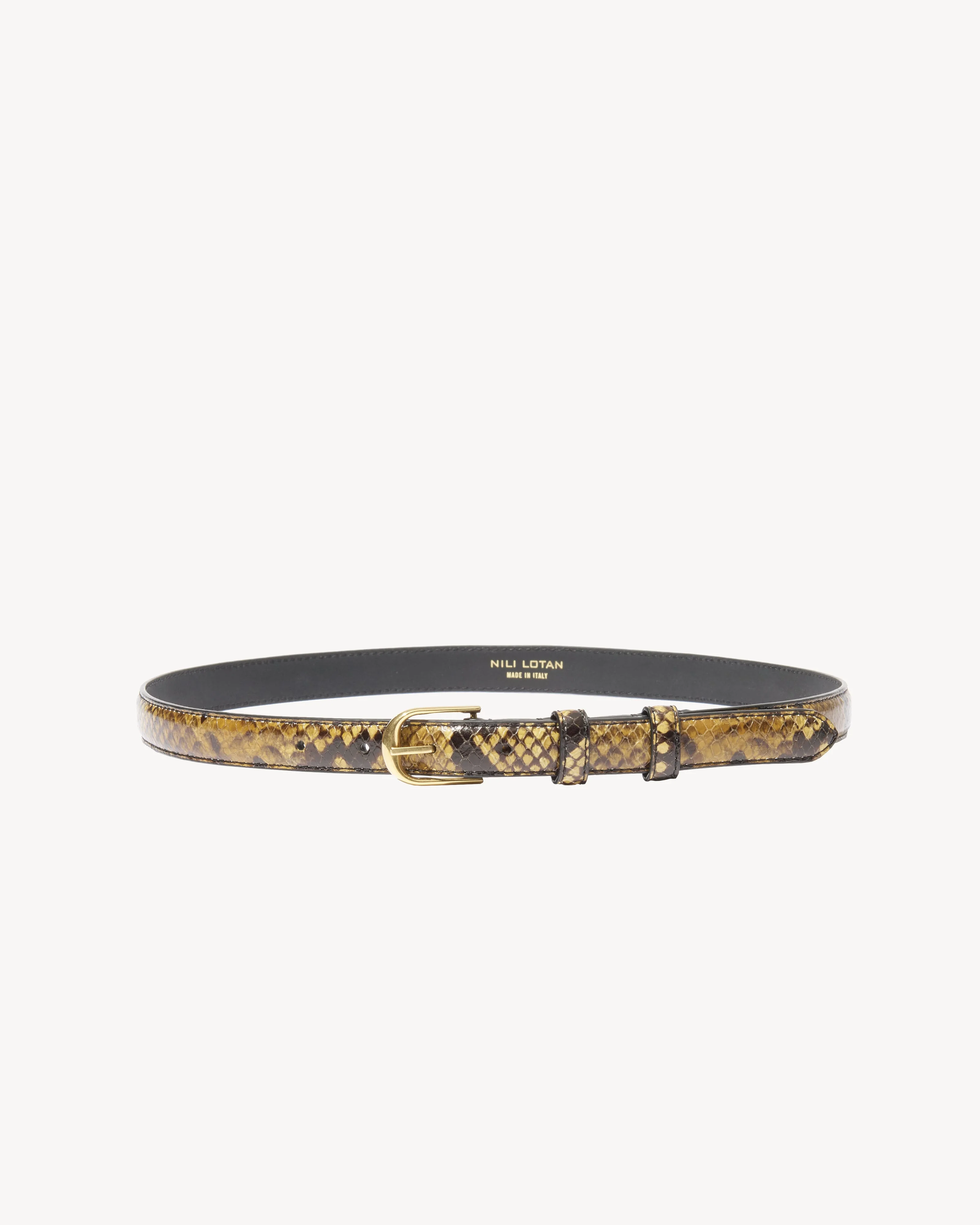 A narrow 3/4" belt inspired by Nili’s personal favorite vintage belt, featuring a solid brass buckle with special plating to look like polished brass. Croc embossed calfskin, made in Italy. Belt width; .8" Prong to middle hole; 25.6", 27.6", 29.5", 31.5", 33.5", 35.4", 37.4" - 100% Calfskin Leather - Professional leather care only