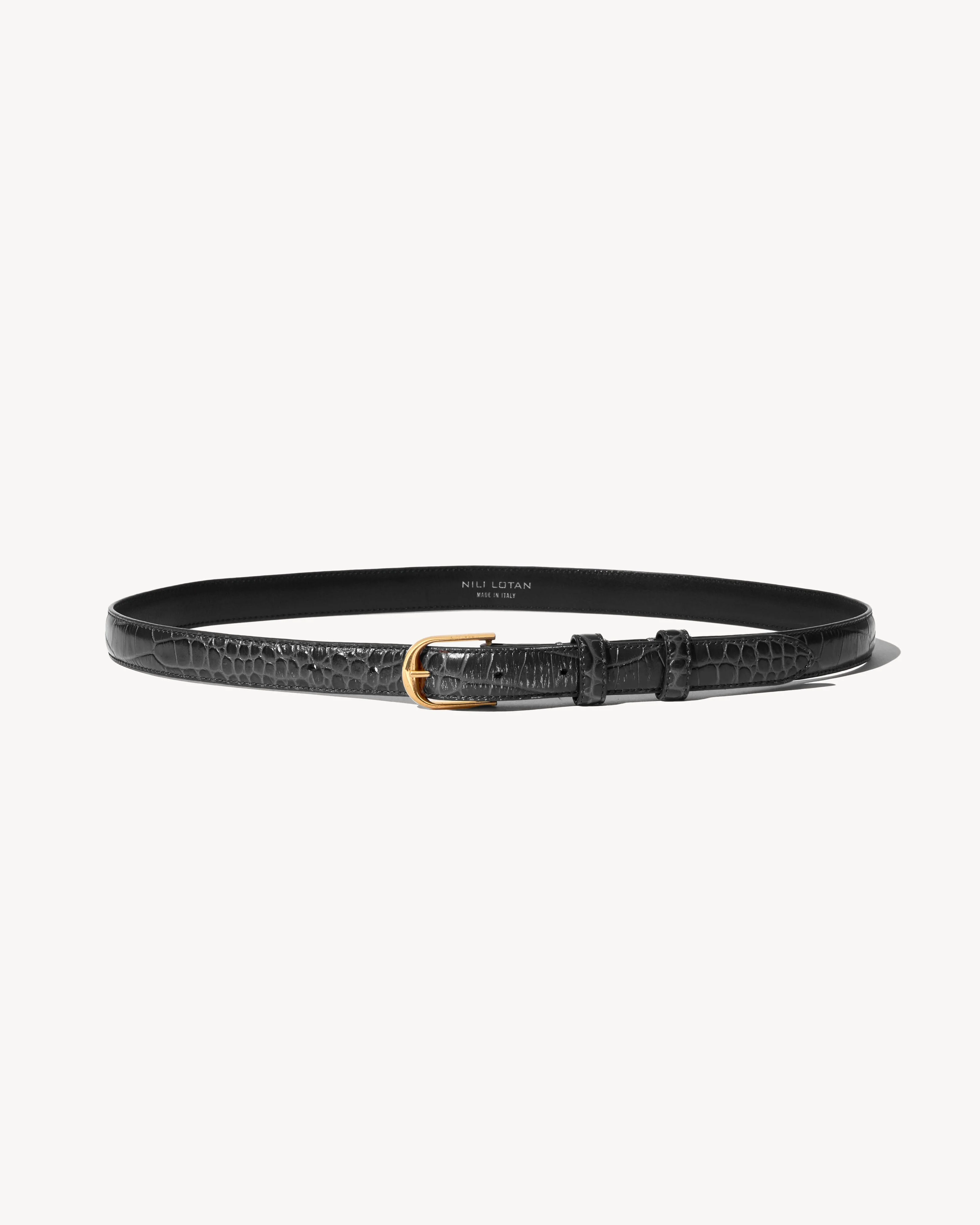 A narrow 3/4" belt inspired by Nili’s personal favorite vintage belt, featuring a solid brass buckle with special plating to look like polished brass. Croc embossed calfskin, made in Italy. SIZE & FIT " Measurements are in CM. Size is determined by measuring from center bar of buckle to the third hole. Total width of belt is 2cm. Size 75: 75cm to 3rd hole, total length is 90cm Total Length: 35"" Size 80: 80cm to 3rd hole, total length is 95cm Total Length: 37"" Size 85: 85cm to 3rd hole, total length is 100 cm Total Length: 39' Size 90: 90cm to 3rd hole, total length is 105 cm Total Length: 41"" " COMPOSITION & CARE 100% CALFSKIN, IMPORTED PROFESSIONAL LEATHER CARE ONLY