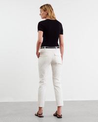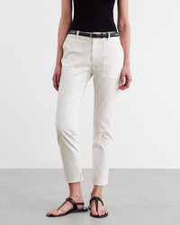 <!--td {border: 1px solid #cccccc;}br {mso-data-placement:same-cell;}--> Flat front, low-rise slim pant. Raw hem. Front patch pockets. Back flap pockets. Belt loops. Designed to hit ankle length. Made in USA COMPOSITION & CARE 98% COTTON, 2% ELASTANE DO NOT BLEACH MACHINE WASH COLD TUMBLE DRY LOW LOW IRON