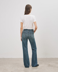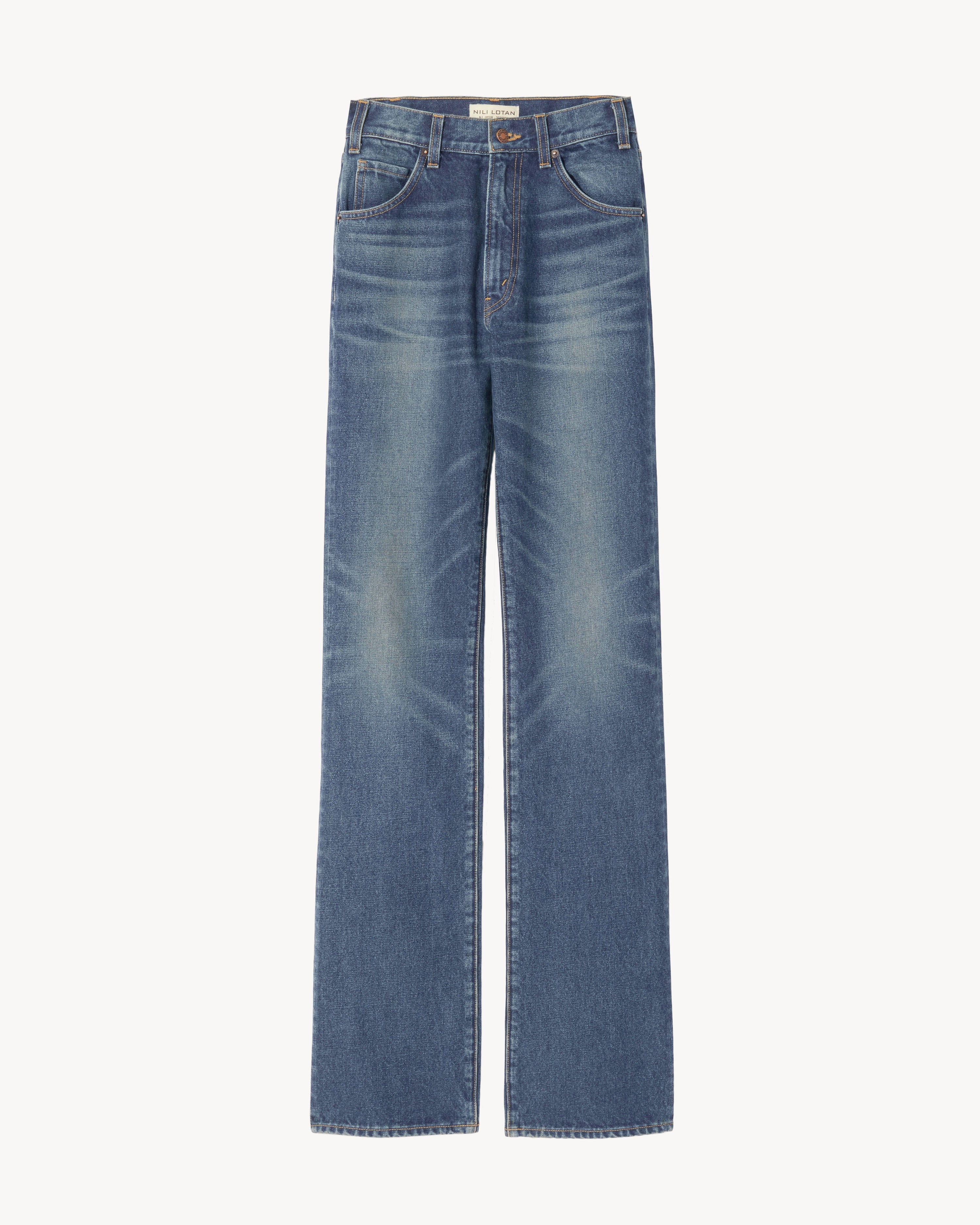 Non-stretch super high-waisted fitted straight leg jean. Made in USA SIZE & FIT Model is 5'11 and wears a size 27. For exact measurements by size, view our size guide. COMPOSITION & CARE 100% COTTON MACHINE WASH COLD TUMBLE DRY LOW LOW IRON