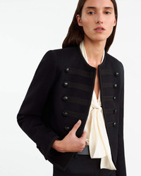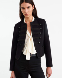 Shrunken collarless jacket in Italian wool. Custom rib trim. Signature crest buttons in shiny black. No front closure. Button details at front and cuff. COMPOSITION & CARE 100% VIRGIN WOOL DRY CLEAN ONLY LOW IRON
