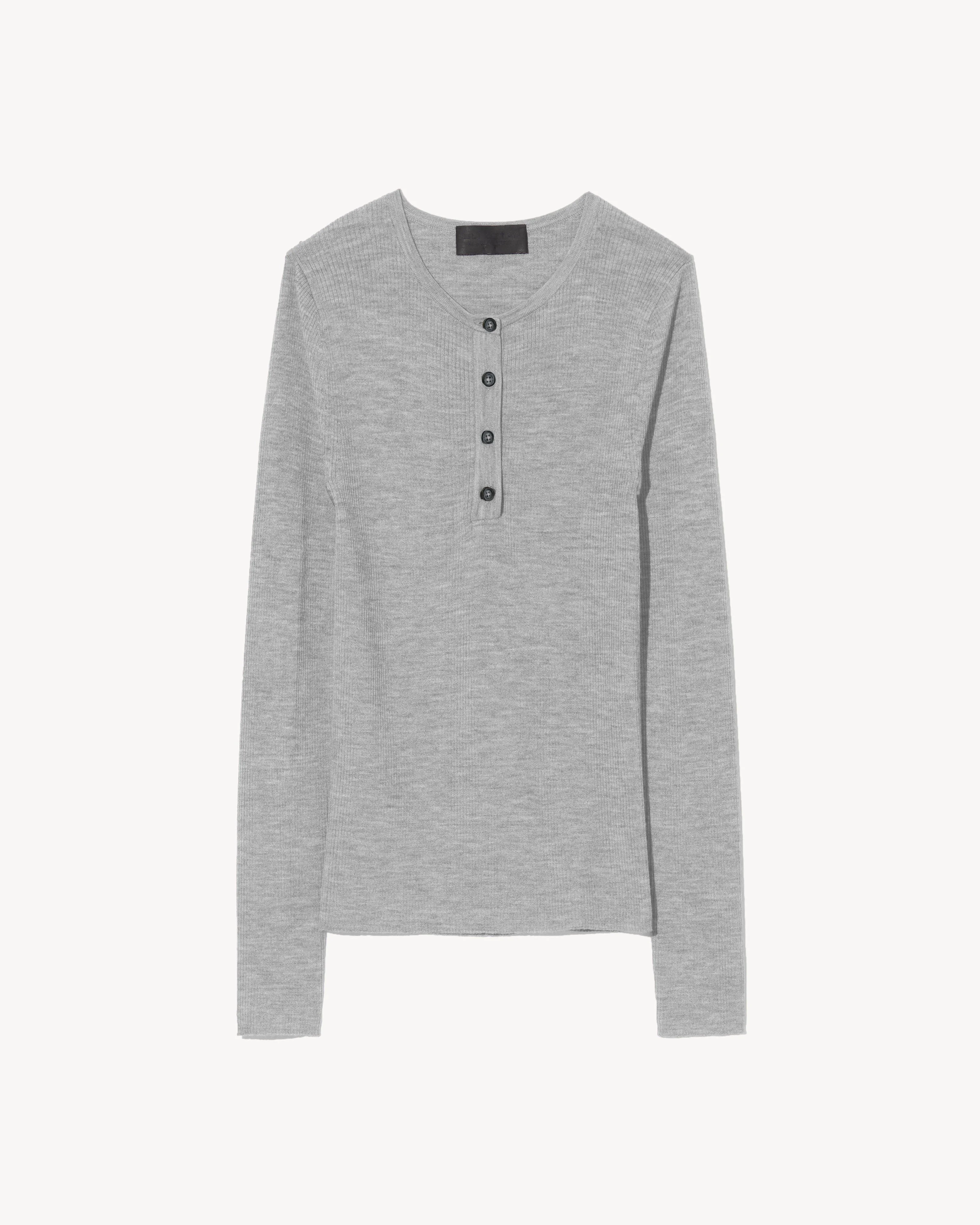 Slim fit fine gauge pullover long sleeve henley sweater in Italian merino silk blend. Regular length. Faux horn button closure. Tubular neck trim. Fashioning detail along arm hole and shoulder. COMPOSITION & CARE 70% MERINO WOOL 30% SILK DRY CLEAN RECOMMENDED
