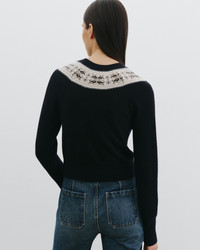 Long sleeve cardigan in cashmere. Medium weight in jersey stitch with jacquard fair isle pattern. Slim fit. Medium body length. Regular length raglan sleeve. 1x1 rib at cuff and hem. 1x1 rib double layer neck trim. Grosgrain at center front placket with gold crest button closure. Jacquard fair isle pattern. Fashioning at armhole and sleeve. - 100% Cashmere - Dry clean only