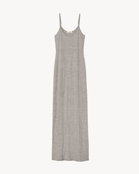 Fitted floor length tank dress. Adjustable straps. Fitted at body, waist and hips. Straight to floor. Natural stretch. Made in USA COMPOSITION & CARE 100% COTTON MACHINE WASH COLD TUMBLE DRY LOW LOW IRON DO NOT BLEACH