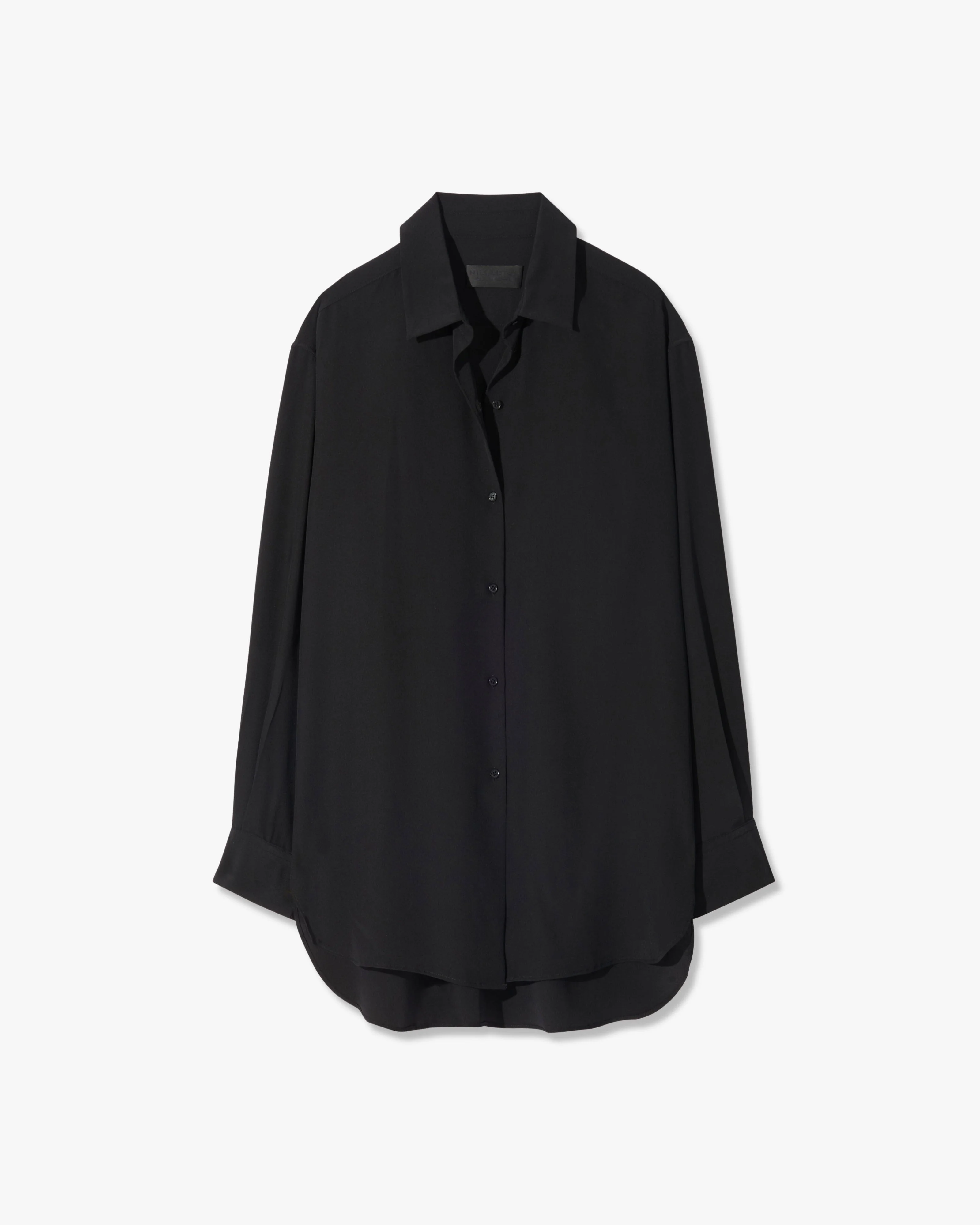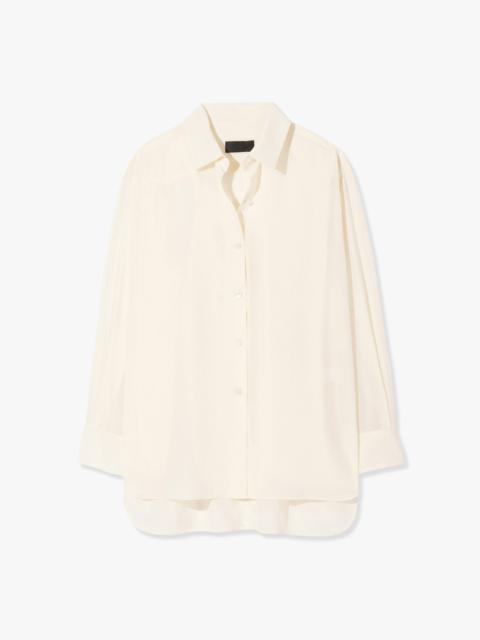 Oversized long-sleeved button-front shirt in fluid silk crepe de chine. Dropped shoulder. Spread collar. Shirred back yoke. Curved shirttail hem. Minimally styled with clean front and tonal buttons. Made in USA SIZE & FIT Model wears size S. For exact measurements by size, view our size guide. COMPOSITION & CARE 100% SILK, MADE IN USA OF IMPORTED FABRIC DRY CLEAN ONLY LOW IRON