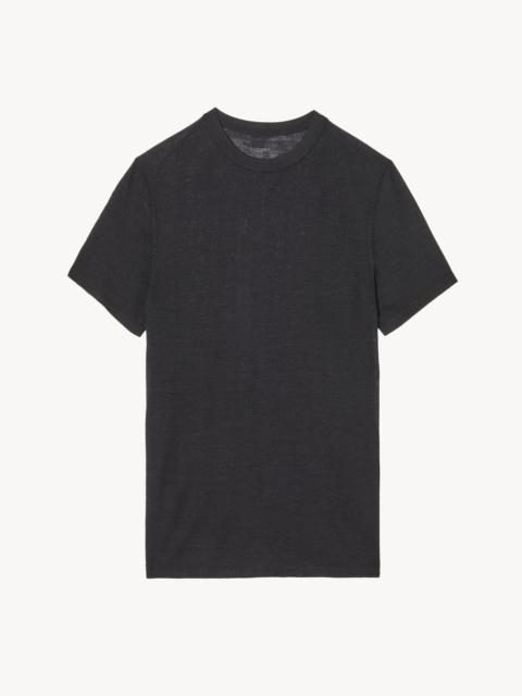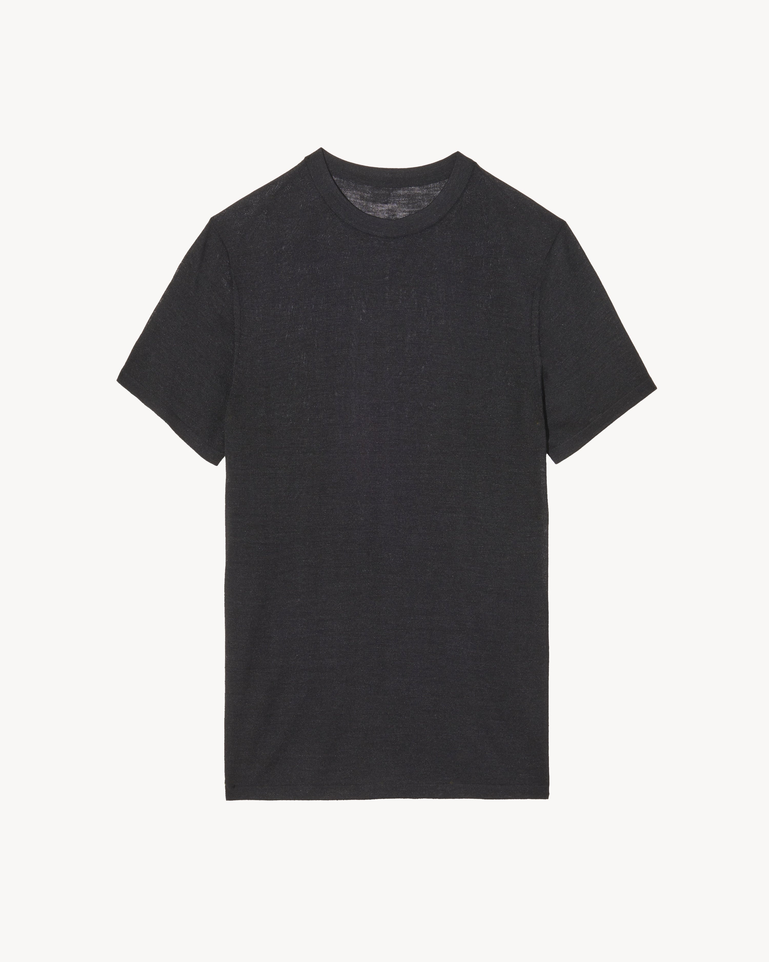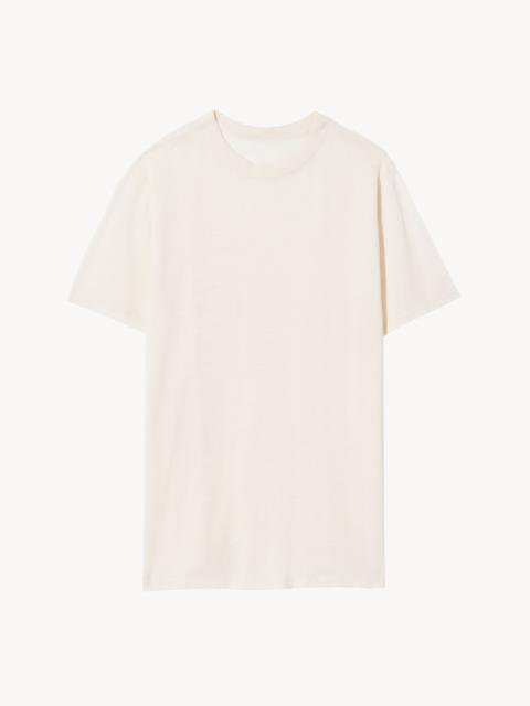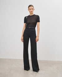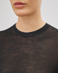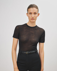 Fine gauge sheer knit boxy tee. Fully fashioned at arm hole, front neck, and shoulder. Tubular body and sleeve. SIZE & FIT Model is 5'11 with 32.5" bust, 25.5" waist, and 35" low hip. Model wears size S. Size S measures approximately 23" front body length, 17 3/8" chest width, 7 1/2" sleeve length from shoulder. COMPOSITION & CARE 100% SILK DRY CLEAN RECOMMENDED