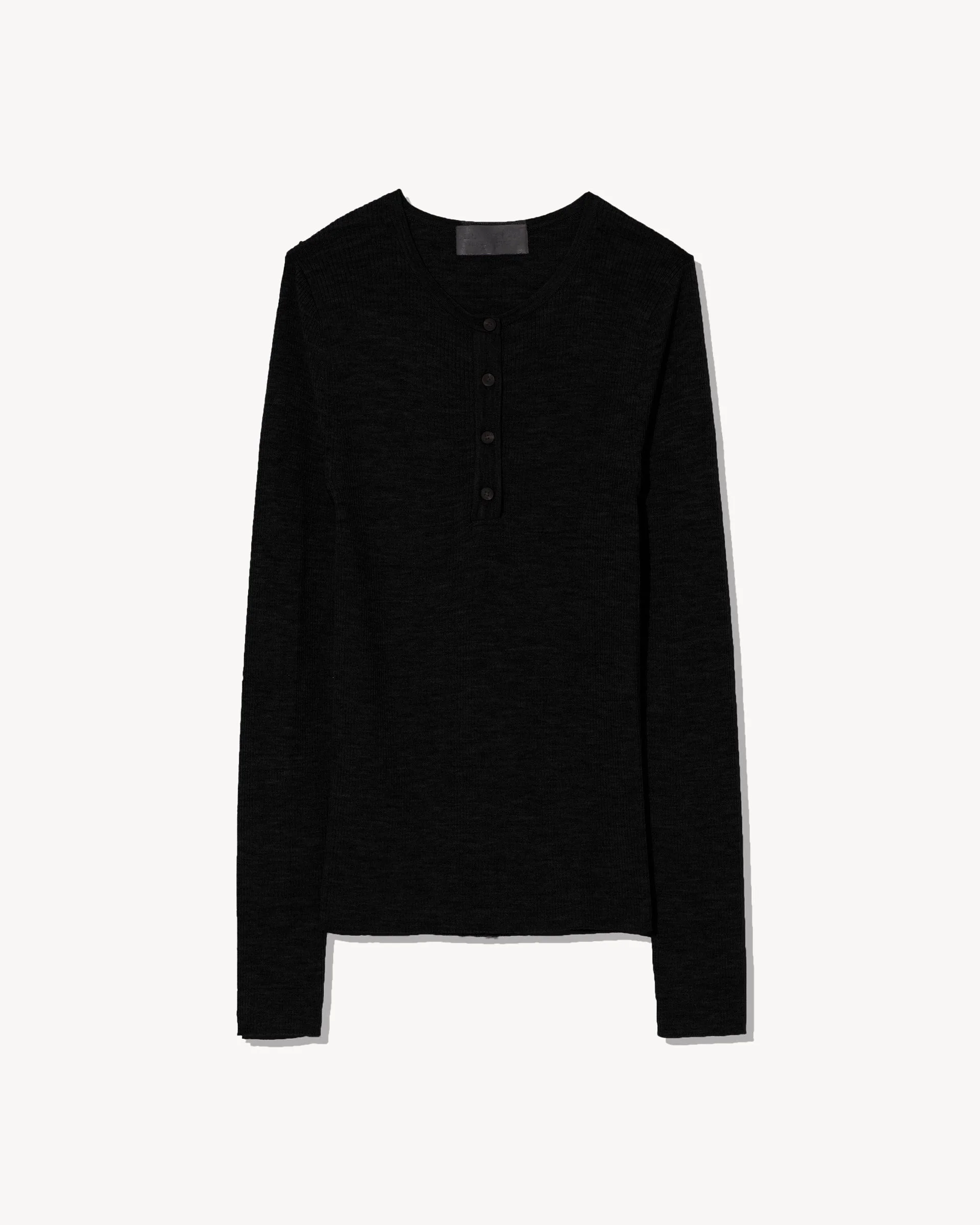 Slim fit fine gauge pullover long sleeve henley sweater in Italian merino silk blend. Regular length. Faux horn button closure. Tubular neck trim. Fashioning detail along arm hole and shoulder. COMPOSITION & CARE 70% MERINO WOOL 30% SILK DRY CLEAN RECOMMENDED