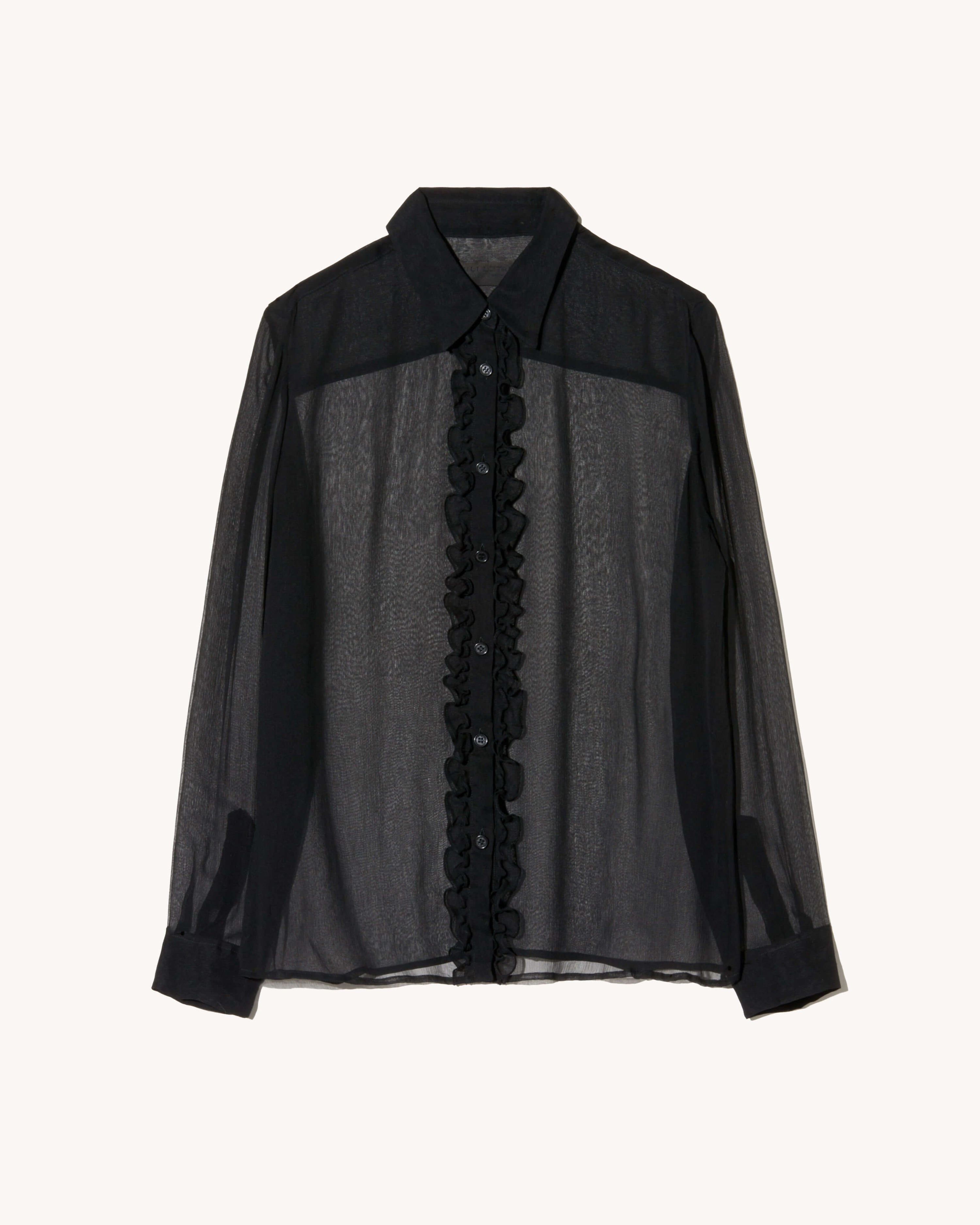 Classic slim fit button up collared shirt in crinkle silk. Double layer ruffle detail at front placket. Classic cuff placket detail with button closure. Made in USA COMPOSITION & CARE 100% SILK Dry clean only Low iron