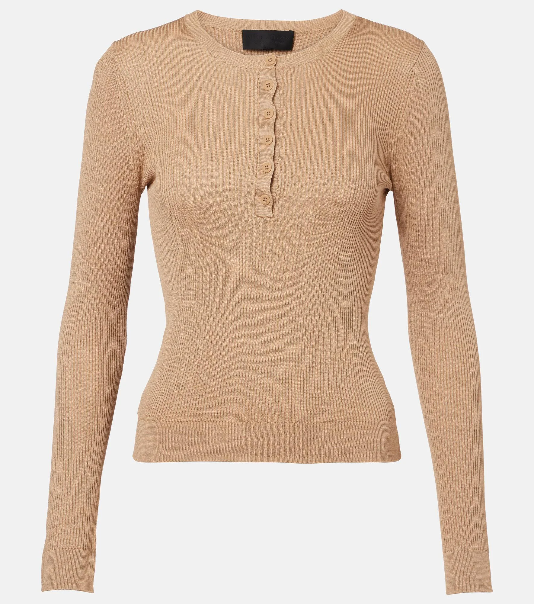 Invest in Nili Lotan's timeless wardrobe staples – where impeccable fit meets sophisticated tailoring. The Kyrie shirt is crafted from ribbed-knit Italian silk and shaped into a classic Henley silhouette. Product Details - Material: 100% silk - Care instructions: dry clean - Made in China - Designer color name: Camel - Item color: beige - Item number: P01062390 Size & Fit - True to size - Fitted - Stretchy fabric - Slightly cropped - The model seen in the picture is 178cm-5'10" and wearing a size XS