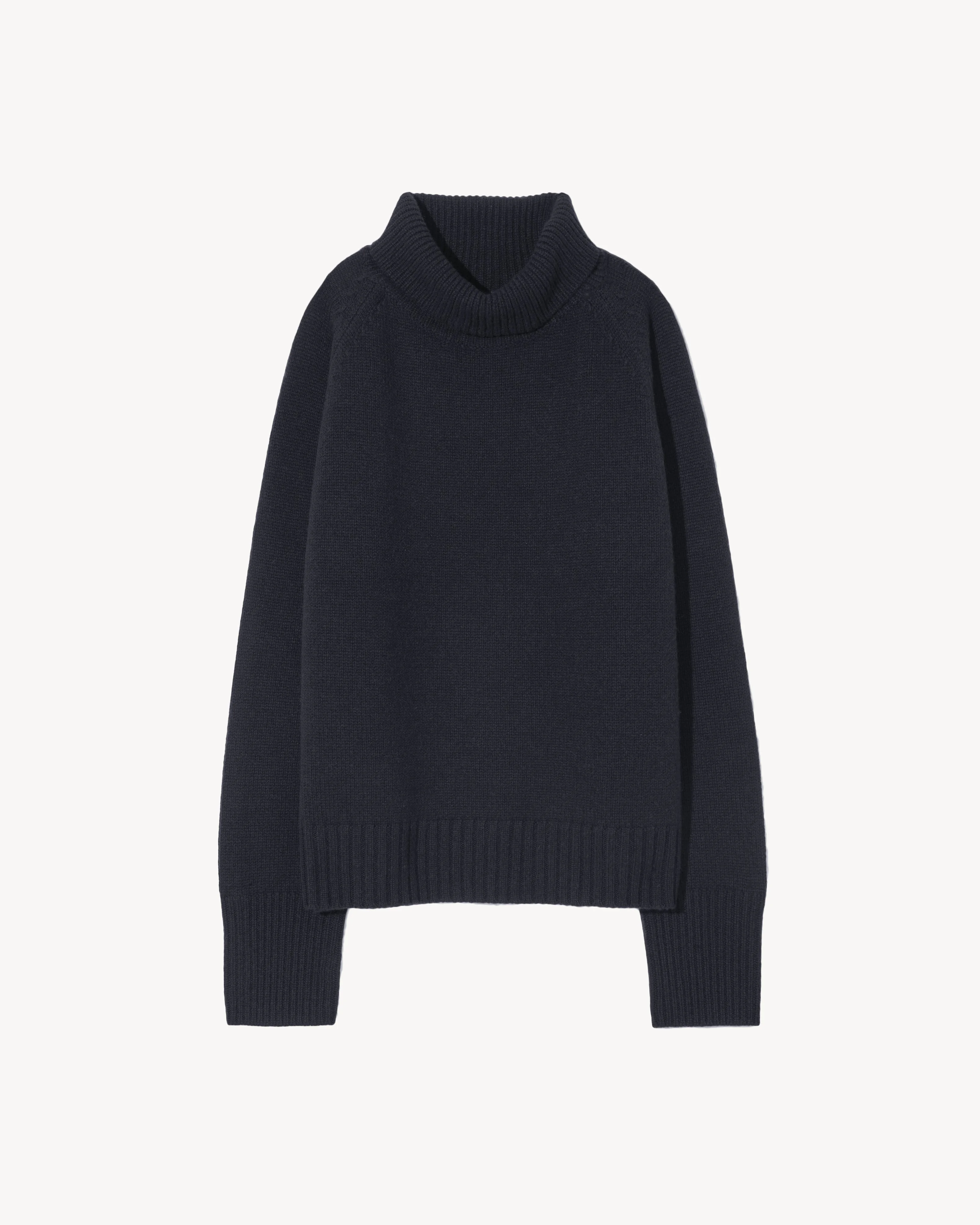 Relaxed pullover high neck sweater in cashmere. Raglan sleeve. Fashioning at sleeve. Rib detail at side seams. Rib variation trim at neck, sleeve and hem. Signature center back cable knit detail. COMPOSITION & CARE 100% Cashmere / Imported. DRY CLEAN RECOMMENDED