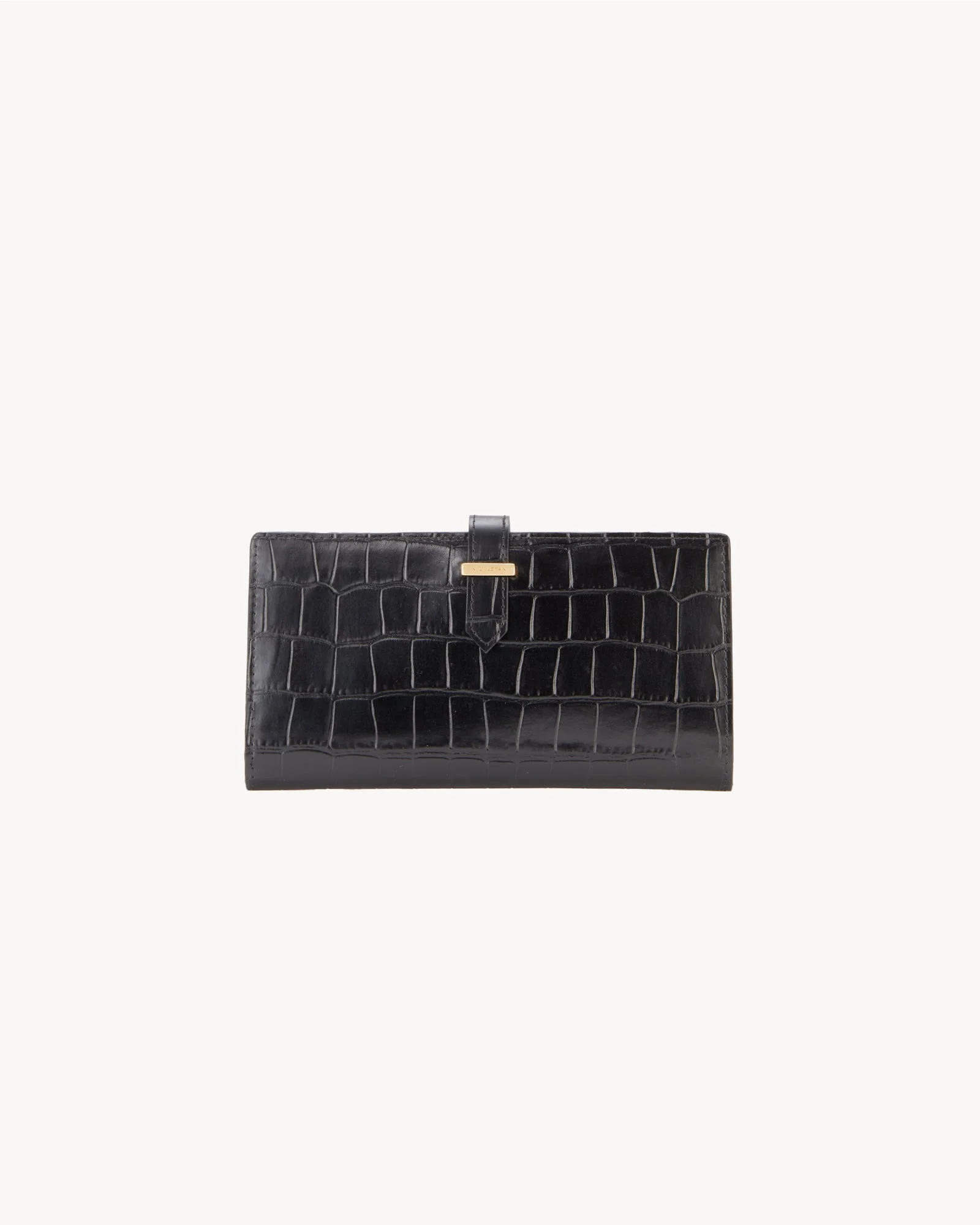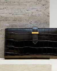 Wallet in Italian embossed calfskin. Crocodile pattern. Interior credit card slots. Interior bill compartments. Leather strap closure. Custom branded clasp hardware in custom antique gold finish. Made in Italy - 100% Italian Embossed Croc Exterior And Interior. - Professional leather care only
