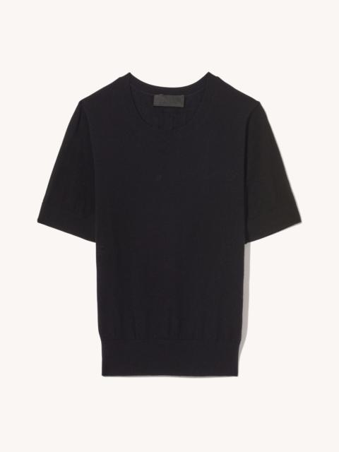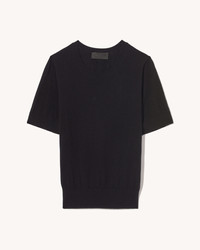 Fine gauge short sleeve sweater in Italian fine merino wool. Rib trim at neck, sleeve and hem. Single layer rib along neck. Fashioning along arm hole and shoulder. Signature center back cable knit detail. COMPOSITION & CARE 100% MERINO WOOL DRY CLEAN RECOMMENDED
