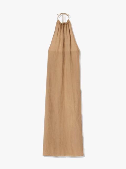Relaxed floor length halter dress in Japanese featherweight linen. Self tie halter neck. Adjustable neck for desired coverage. Low scoop back. Elastic at back. Side seam pockets. Made in USA COMPOSITION & CARE 100% Linen Dry clean only Low iron