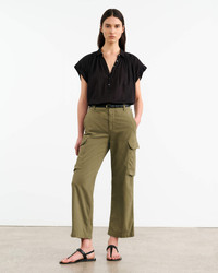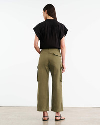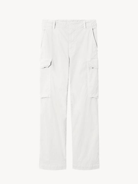 Flat front, mid-rise, relaxed straight leg pant. Cargo pocket details. Back pocket flaps. Hidden button closure. Designed for a 28" inseam—tailor for a personalized fit. Made in USA COMPOSITION & CARE 98% COTTON 2% ELASTANE, MADE IN USA OF IMPORTED FABRIC Machine wash cold Tumble dry low Low iron Dry clean Do not bleach