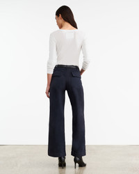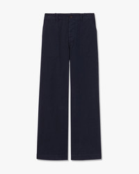 Flat front, mid-rise relaxed straight leg pant. Front patch pockets. Back patch pockets with flaps. Back darts. Zip fly. Button closure. Belt loops. Made in USA COMPOSITION & CARE 100% COTTON; MADE IN USA OF IMPORTED FABRIC MACHINE WASH COLD TUMBLE DRY LOW LOW IRON DRY CLEAN DO NOT BLEACH