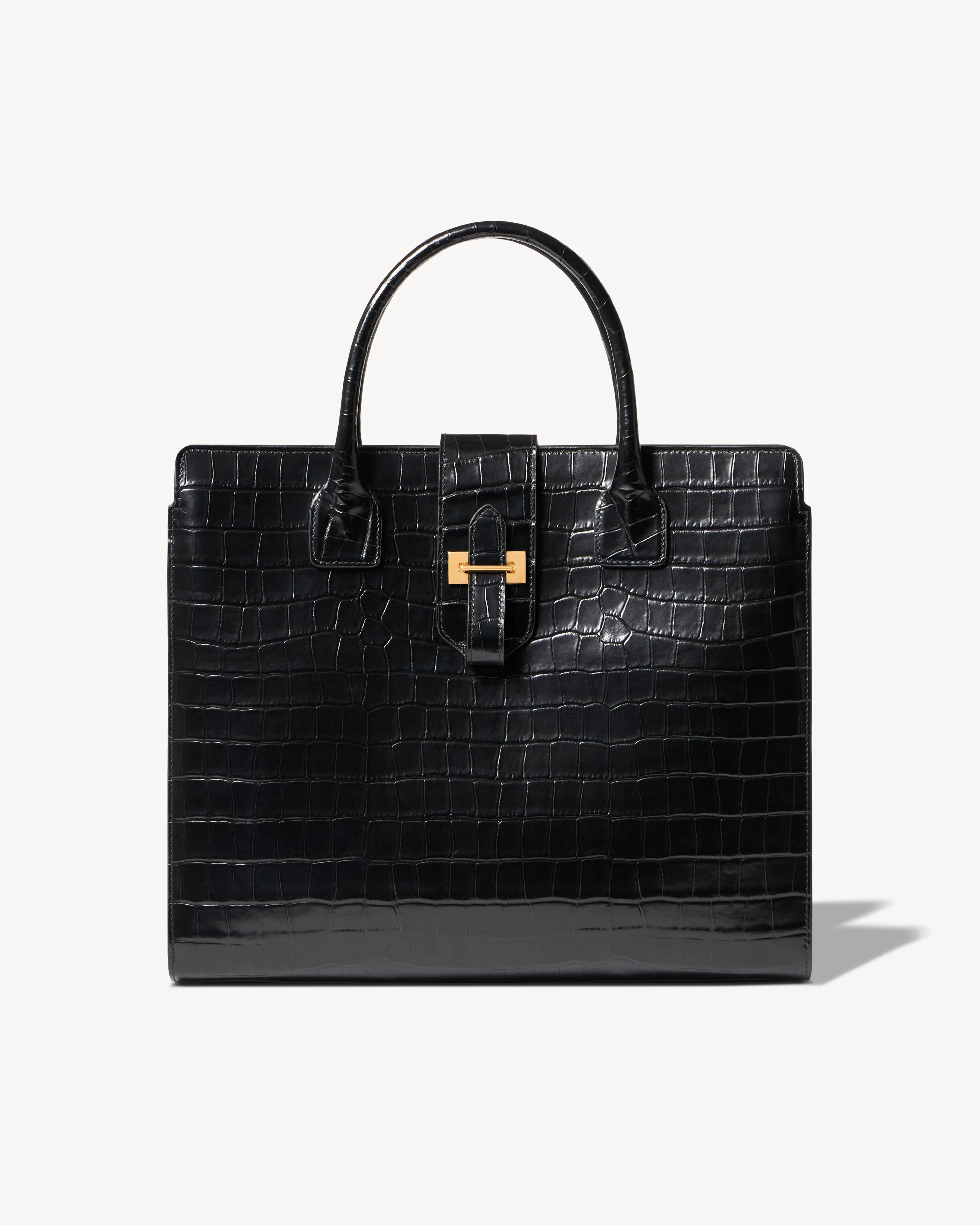 Top-handle bag in Italian embossed croc (stamped calfskin). Semi-structured silhouette with a soft handfeel that collapses intentionally over time. Structured base. Removable interior strap allows for shoulder or crossbody wear. Removable interior pouch. Interior back wall zip pocket. No exterior logo. Interior debossed NILI LOTAN NEW YORK “Made In” logo. Hardware includes logo zipper pullers at back wall pocket and removable pouch, custom-designed hardware at front, D-ring and dog clip closure at interior, and metal feet at base of bag. Expertly crafted in Italy by master artisans. Exterior leather is sourced from LWG-certified Italian tanneries, emphasizing sustainable practices. Interior suede is developed specifically for high-end lining. All hardware is nickel-free, hand-plated in a custom gold finish created exclusively for Nili Lotan. Dimensions (Inches): 12” Height , 14” Length , 5.5” Depth , 5” Handle Drop , 15.5” Shoulder Drop - Embossed Croc - Professional leather care only