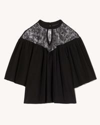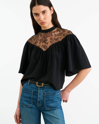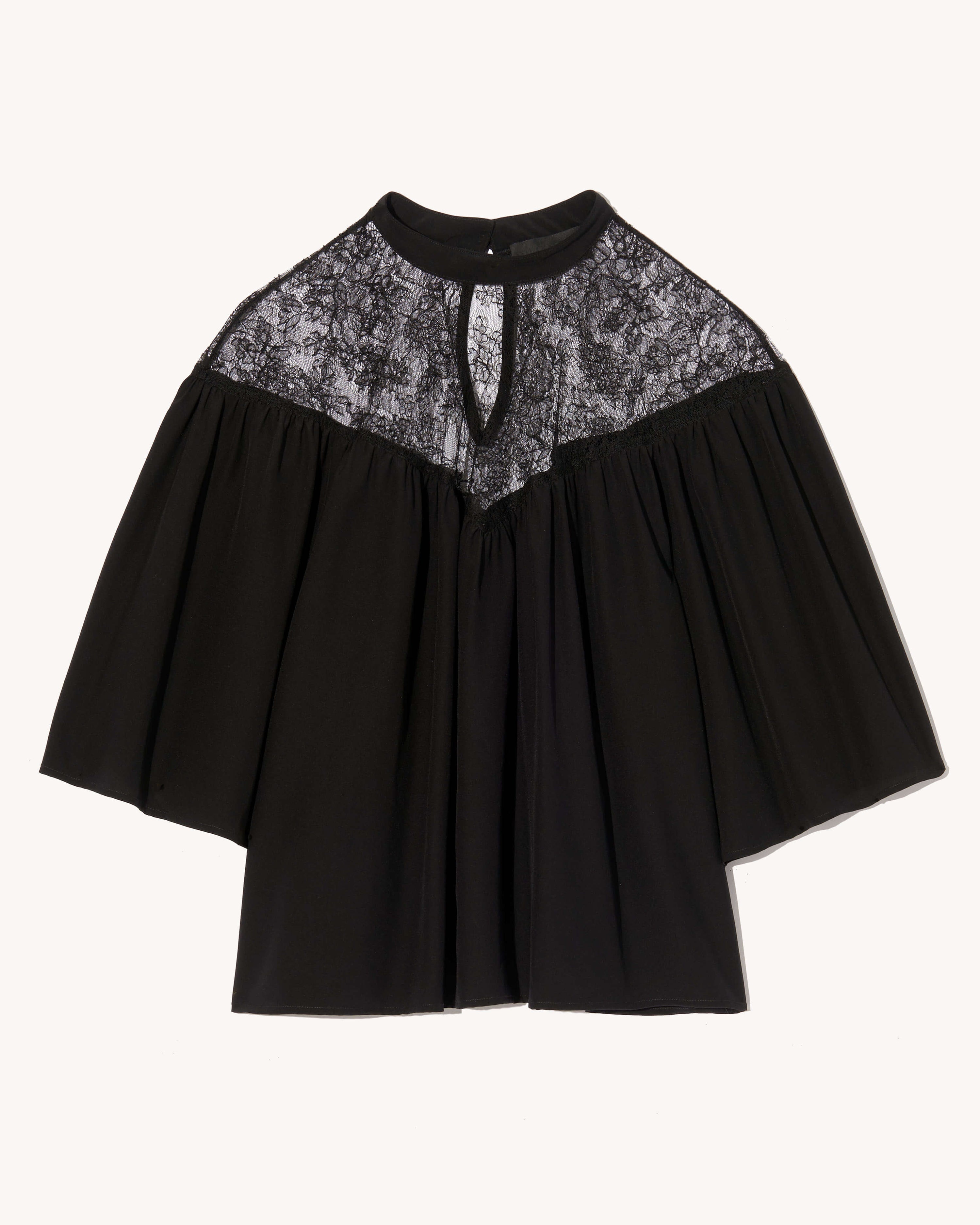 Cropped relaxed fit short sleeve blouse in silk crepe de chine. Lace yoke detail at front and back. Keyhole detail with button closure at back. Made in USA COMPOSITION & CARE 100% Silk Dry clean only Low iron