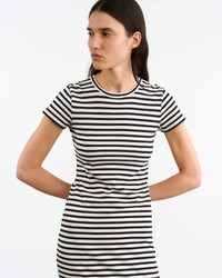 Slim short sleeve mid-length dress in Japanese cotton. Self trim at neck. Room at sweep. Made in USA COMPOSITION & CARE 100% Cotton Machine wash cold Do not bleach Tumble dry low Low iron Dry clean recommended