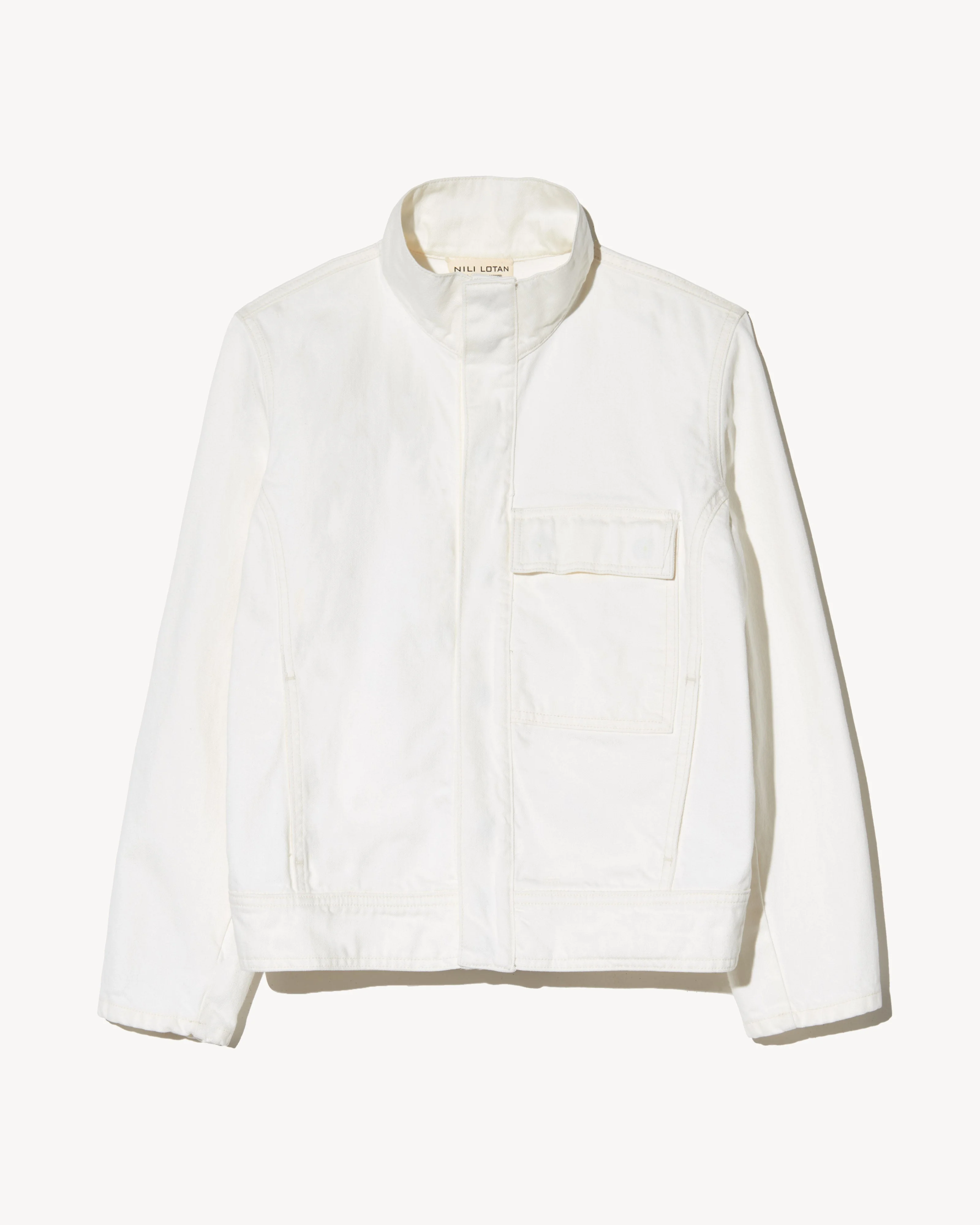 Non-stretch Japanese crosshatch denim boxy, relaxed jacket. Chest pocket detail. Welt pockets. Snap front closure. Unlined. Made in USA COMPOSITION & CARE 100% Cotton Machine wash cold Tumble dry low Medium iron Do not bleach Do not dry clean