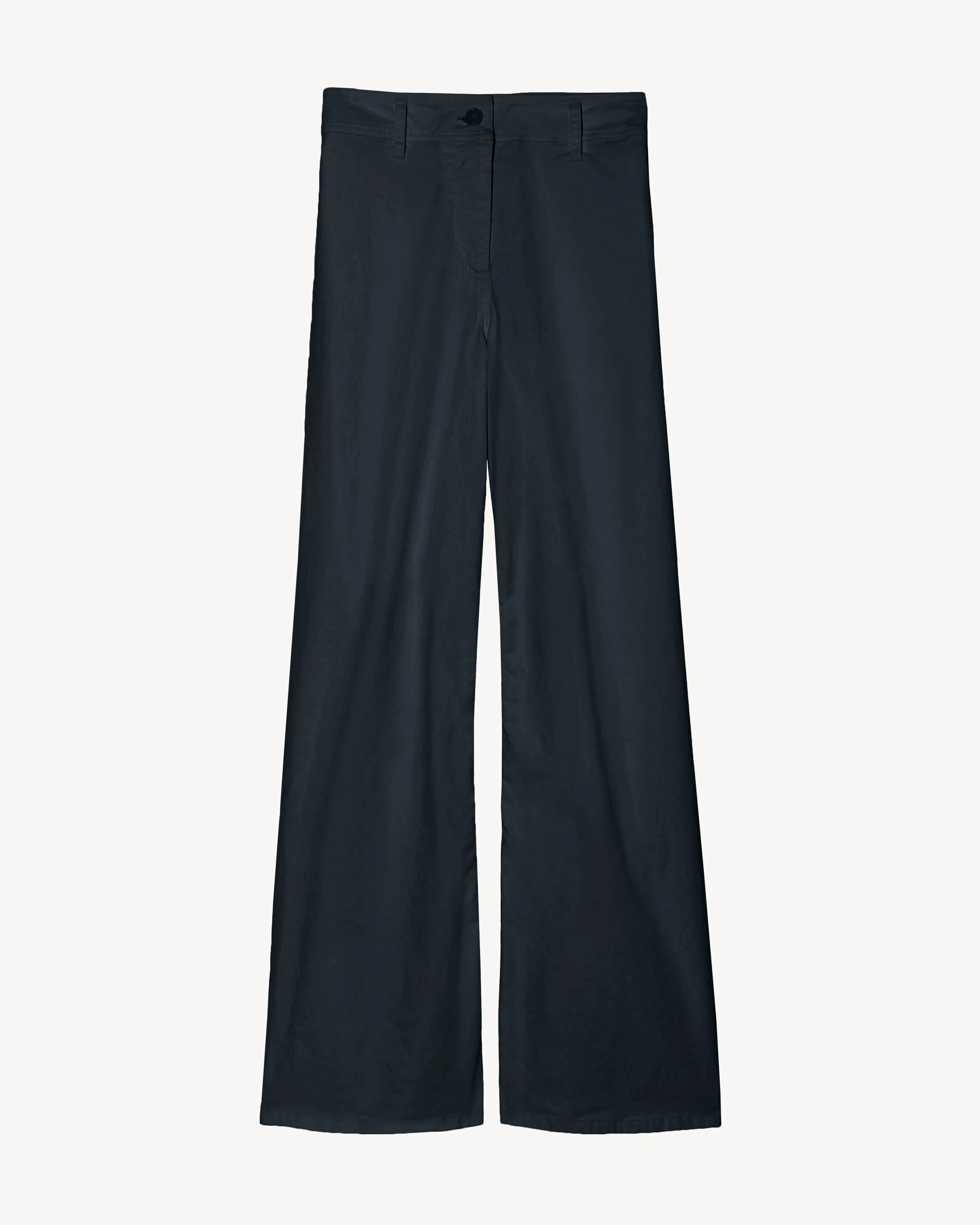 High-rise wide-leg pant in soft brushed stretch twill. Fitted through waist and hip, opens to easy leg. Shorter inseam, hits at ankle. Zip fly and button closure. Clean flat front, with no pockets. Back patch pockets. Made in USA SIZE & FIT Model is 5'11 and wears a size 4. For exact measurements by size, view our size guide. COMPOSITION & CARE 98% COTTON, 2% ELASTANE MACHINE WASH COLD DO NOT BLEACH TUMBLE DRY LOW LOW IRON