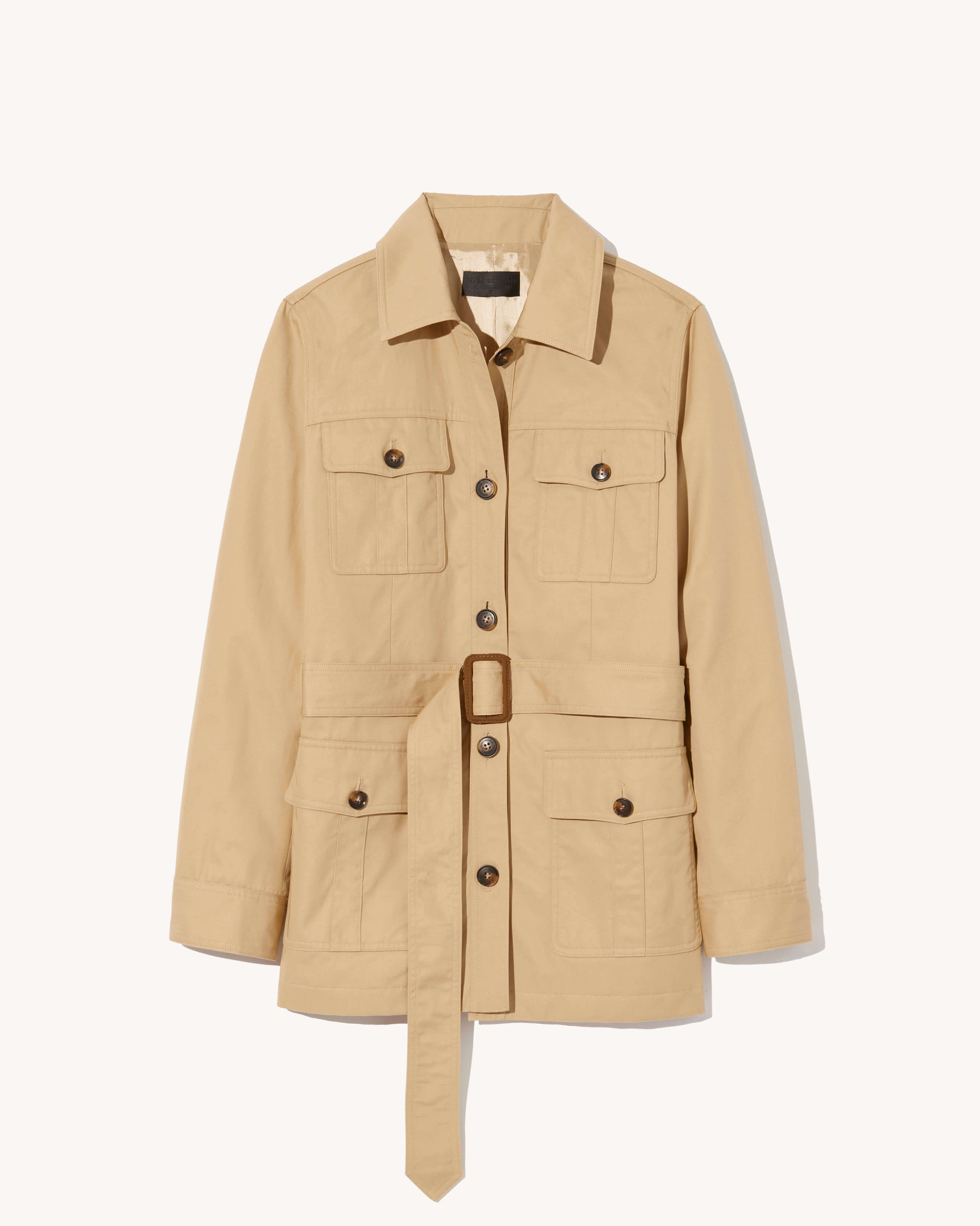 Straight fit utilitary jacket in cotton. Logo horn buttons. Pleated patch pockets. Self tie belt with buckle. Fully lined. COMPOSITION & CARE 100% COTTON Dry clean only Low iron