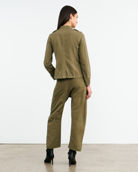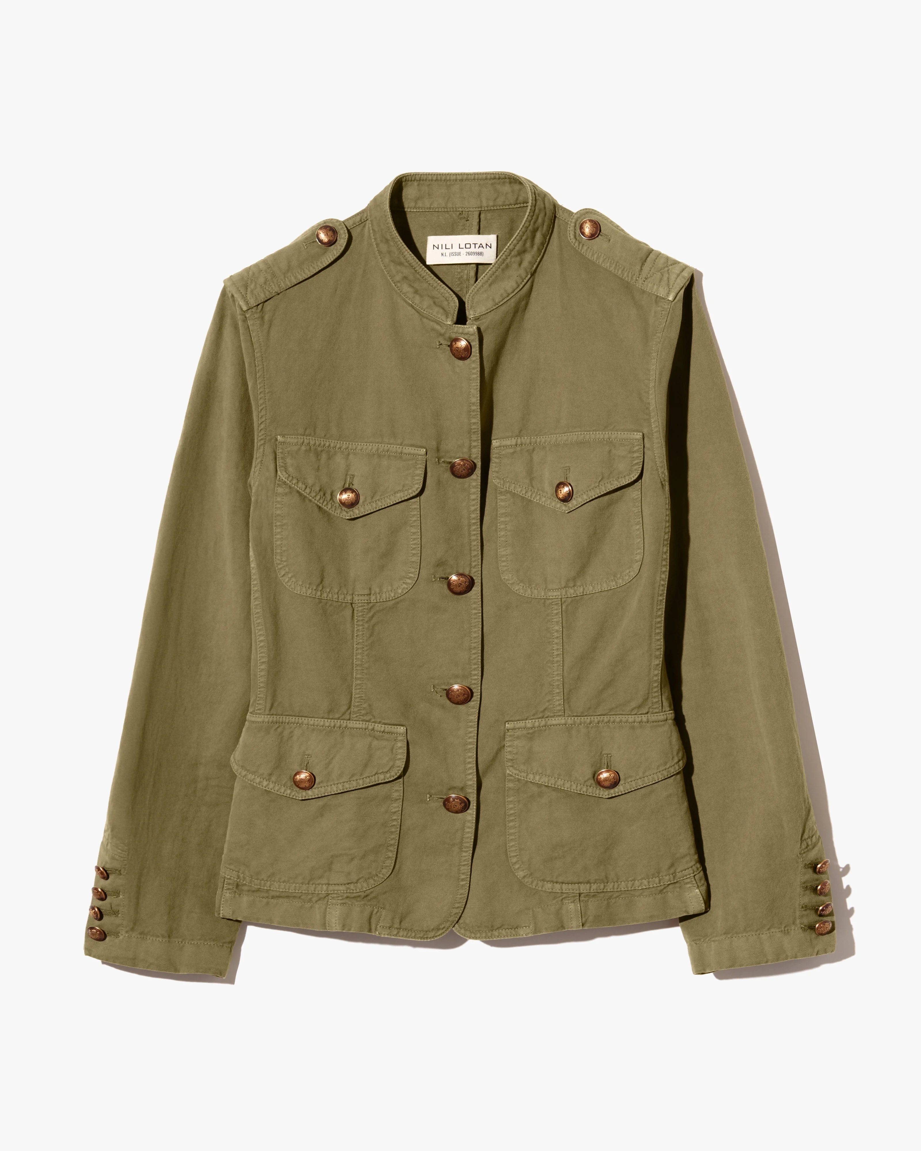 Shrunken slim fit jacket. Stand collar and epaulettes. Patch front pockets with flaps and buttons. Button closure at center front and cuffs. Seaming and topstitching details throughout. Signature crest buttons in antique brass. Back vent. COMPOSITION & CARE 77% Cotton, 23% Linen Do not bleach Do not tumble dry Low iron Dry clean