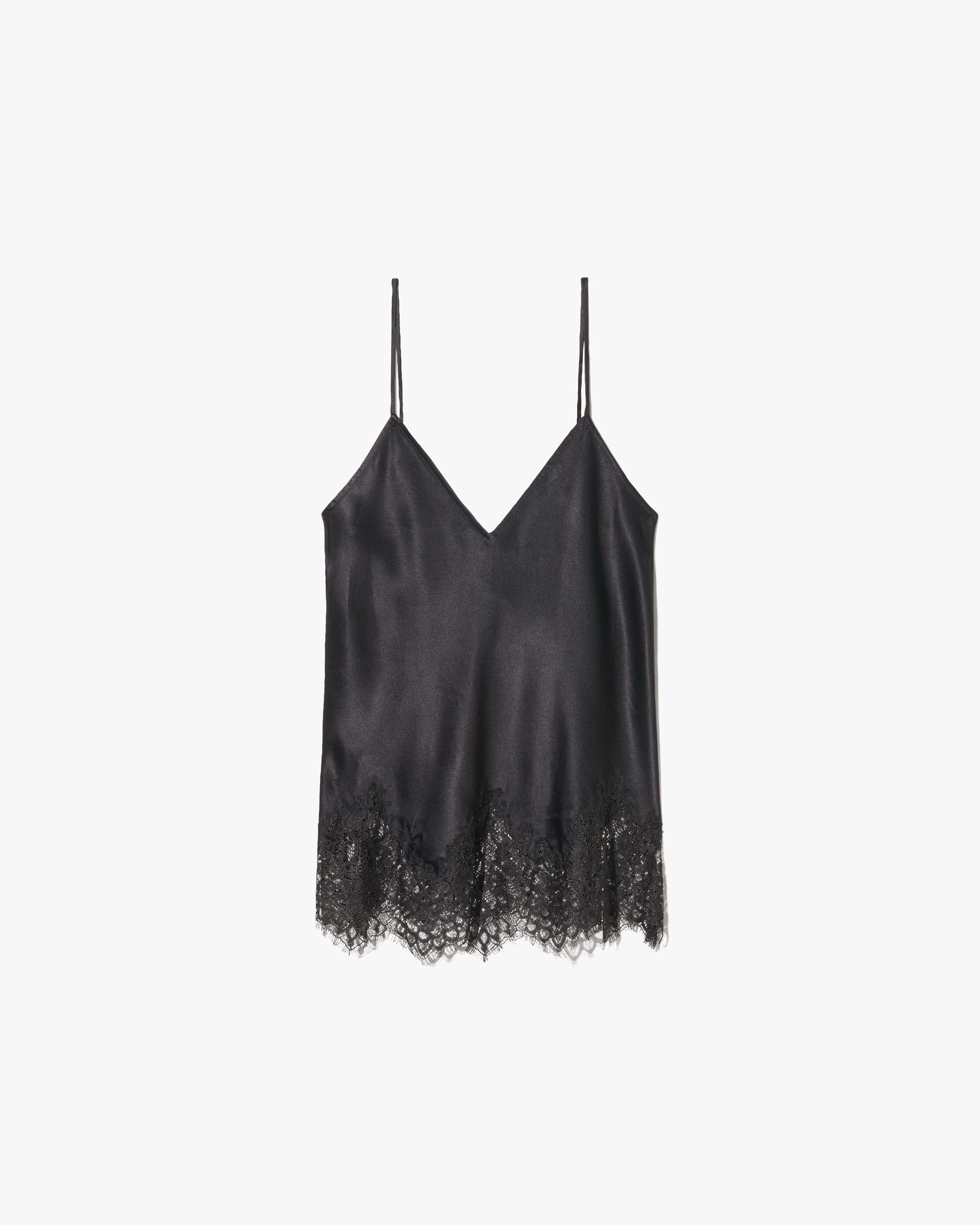 Lace cami top with V-neckline and adjustable slider straps. Delicate lace detailing.