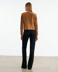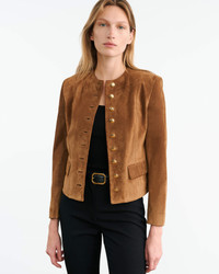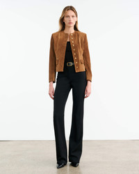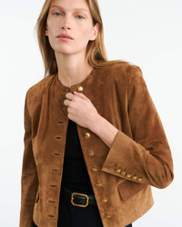 Slim cropped jacket in Italian silky suede calfskin. Shoulder pads. Pockets with flaps. Signature crest buttons in antique brass at front and cuff. Back seams. Fully lined. COMPOSITION & CARE 100% CALFSKIN LEATHER Spot clean only Professional leather care only