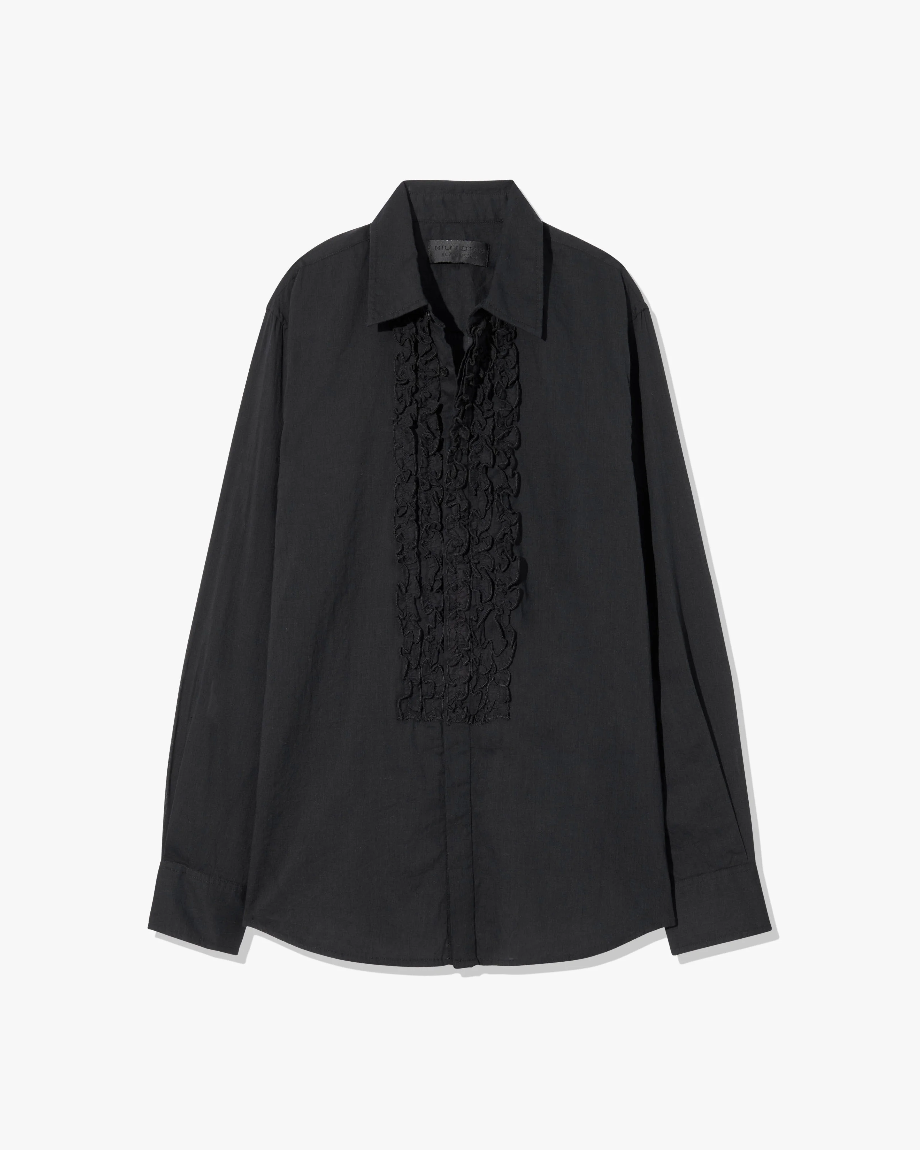 Lightweight cotton voile slim ruffle front blouse. Hidden placket. Ruffle front detail. Custom logo buttons at front and sleeves. Back yoke. Easily able to tuck in. COMPOSITION & CARE 100% COTTON MACHINE WASH COLD DO NOT BLEACH TUMBLE DRY LOW LOW IRON DRY CLEAN