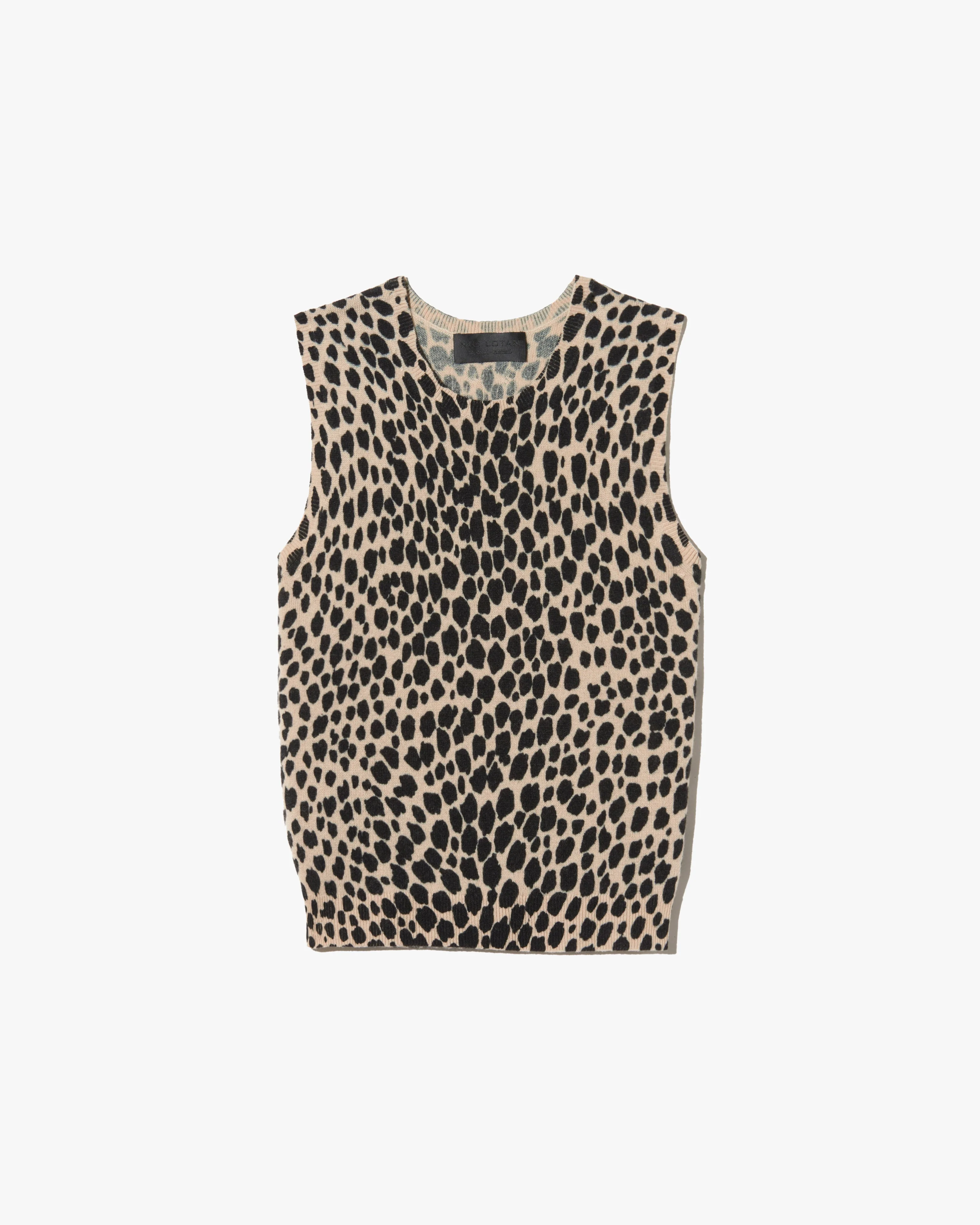 Sleeveless crewneck sweater vest. Cheetah print. Light weight printed jersey stitch. Slim fit. Short length. 1x1 rib at hem. Rib at neck is doubled and finished by hand on inside of neck to ensure printing is on both side of neck trim. Fashioning details at armhole and shoulder. Signature center back cable knit detail. - 100% Cashmere - Dry clean recommended