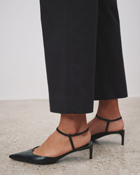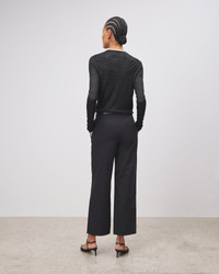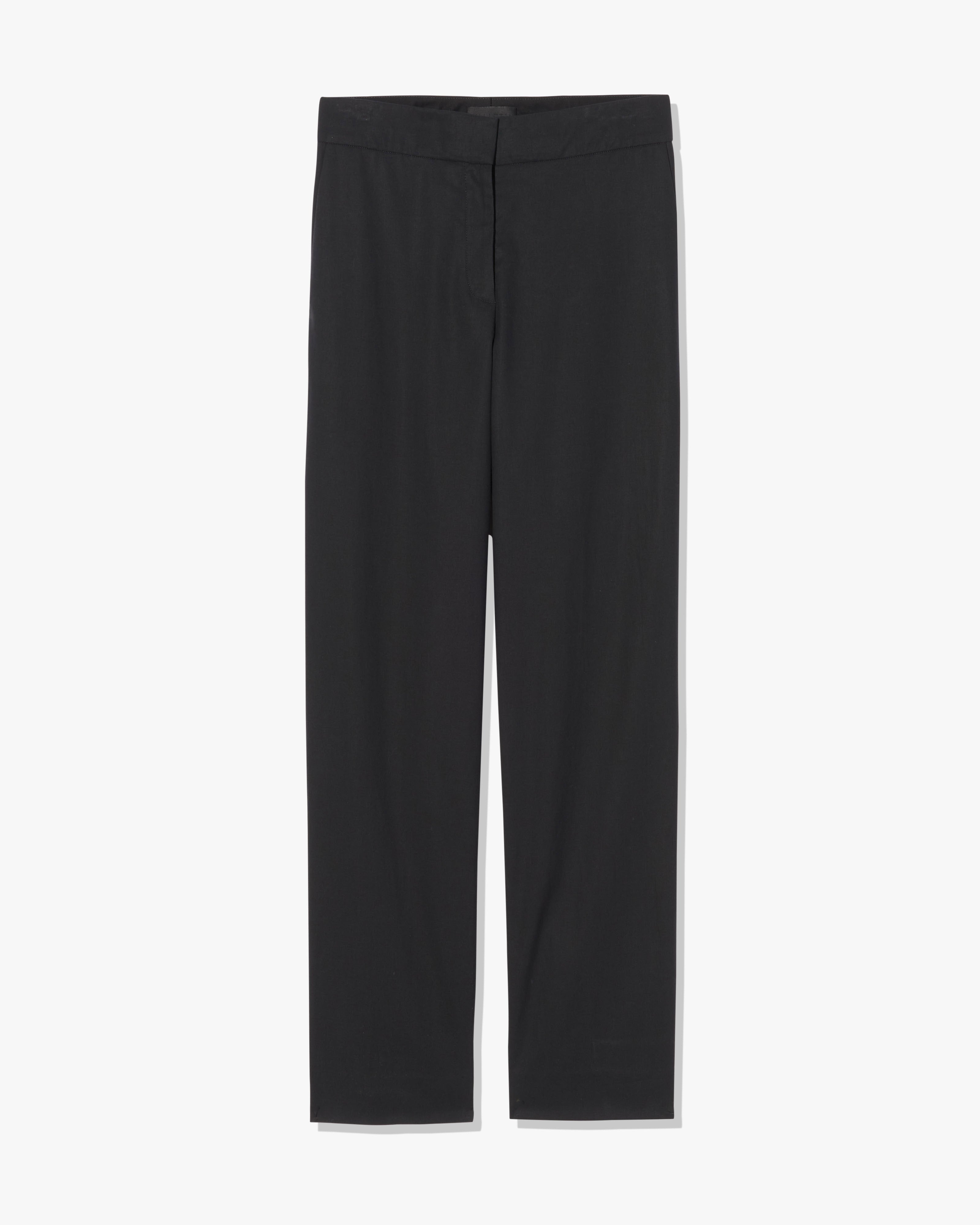 Mid-rise, straight leg cropped pant. Curtain waistband. Slash pockets. Back darts. Made in USA COMPOSITION & CARE 60% COTTON 40% CUPRO, MADE IN USA OF IMPORTED FABRIC MACHINE WASH COLD DO NOT TUMBLE DRY DO NOT BLEACH LOW IRON DRY CLEAN